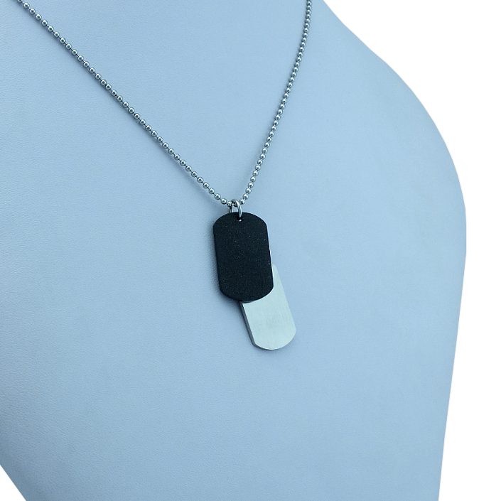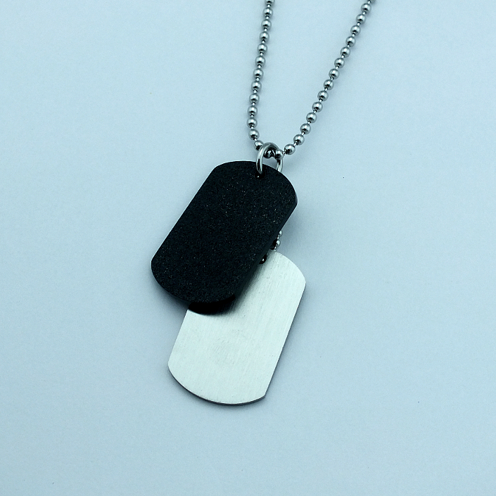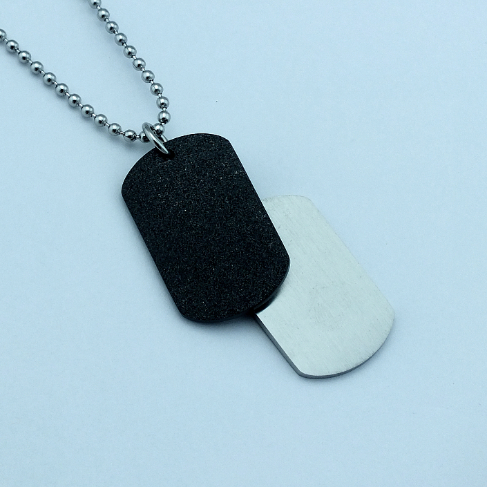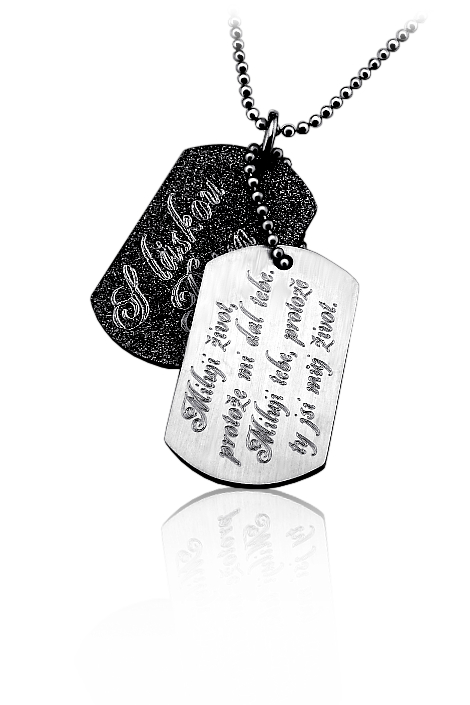 Přívěsek dog tag je vyrobený z matné oceli a zdobený vlastním rytím. Rytí jména nebo iniciálu je už v ceně přívěsku. K psím známkám už je zahrnut řetízek a dárková krabička, na kterou můžeme vyrýt delši věnování. Požadovanou rytinu na známky a věnování na krabičku nám napište do poznámky v objednávce ( třetí krok v košíku ).