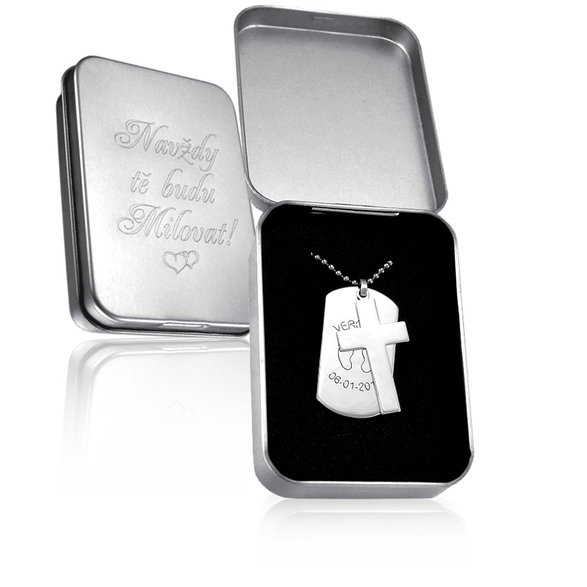 Elegantní přívěsek vyrobený ze stříbra v lesklé povrchové úpravě. Přívěsek Dog Tag je zdobený hladým stříbrným křížkem. Vaše věnování nebo motto ( zvolit lze i jiné, vlastní ) můžeme vyrýt leskle nebo vybarvit černě. K přívěsku už je zahrnuta dárková krabička, na kterou můžeme vyrýt delší věnování. Požadované rytí a věnování na krabičku nám napište do poznámky v objednávce (třetí krok v košíku).