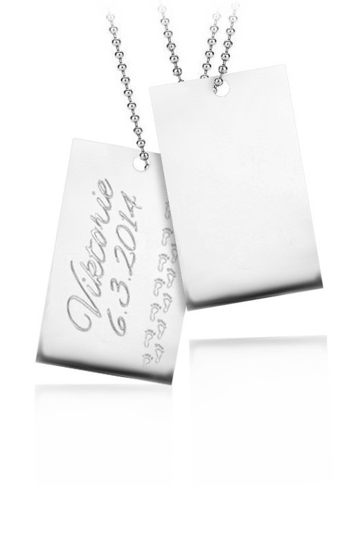 Přívěsek dog tag je vyrobený z leštěné oceli a zdobený vlastním rytím. Rytí jména nebo iniciálu je už v ceně přívěsku. K psím známkám už je zahrnut řetízek a dárková krabička, na kterou můžeme vyrýt delši věnování. Požadovanou rytinu na známky a věnování nám napište do poznámky v objednávce (třetí krok v košíku).