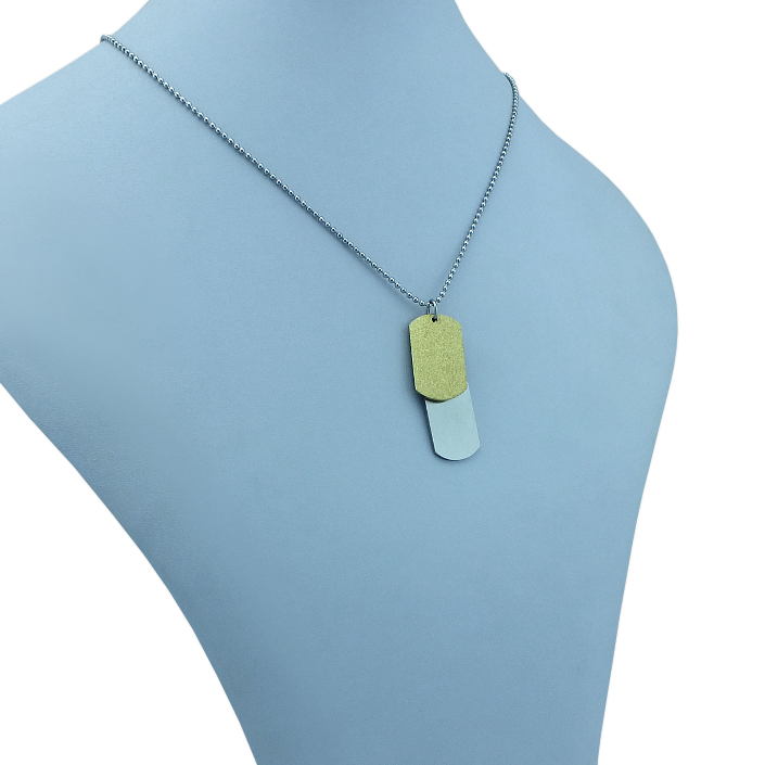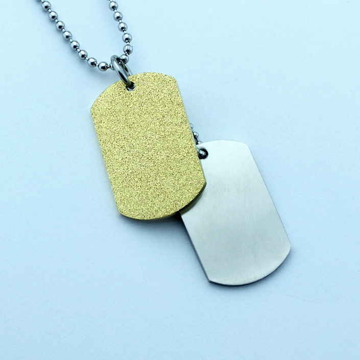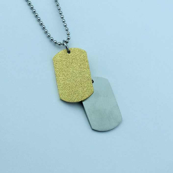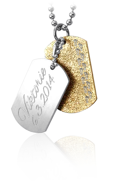 Přívěsek dog tag je vyrobený z matné oceli a zdobený vlastním rytím. Jedna destička je matně pískovaná a druhá je galvanicky pozlacena. Rytí jména nebo iniciálu je už v ceně přívěsku. K psím známkám už je zahrnut řetízek a dárková krabička, na kterou můžeme vyrýt delši věnování. Požadovanou rytinu na známky a věnování na krabičku nám napište do poznámky v objednávce ( třetí krok v košíku ).