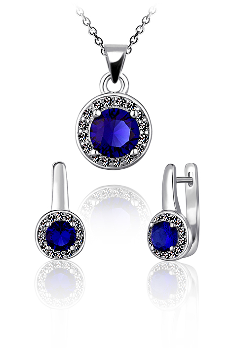 Luxusní stříbrná souprava náhrdelníku a náušnic je zdobena bílými zirkony a modrým safírem (kameny jsou syntetické). Souprava je vhodná pro výjimečné a slavnostní příležitosti ale i na každodení nošení. Antioxidační povrchová úprava rhodiem, šperk má pak vzhled bílého zlata. Řetízek je součástí náhrdelníku s délkou 45 cm.