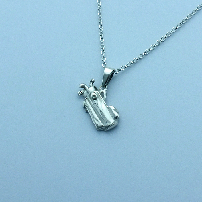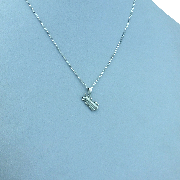 Přívěsek golfový vak je vyroben ze stříbra v lesklé povrchové úpravě. Tento přívěsek je velmi detailně propracovaný a je vhodný jako dárek pro fanoušky nebo hráče tohoto sportu. Délka Golfového vaku je 18 mm a jeho šířka je 8 mm. Průměr očka na řetízek je 7 mm ale v případě potřeby vám ho upravíme. Přívěsek je ze zadní strany prohlouben aby byla váha co nejmenší a pohodlně se nosil. Golfový vak můžeme vyrobit i ze žlutého, popřípadě bílého zlata (cena je dle aktuálního prodeje zlata a zdělíme vám ji na požádání).