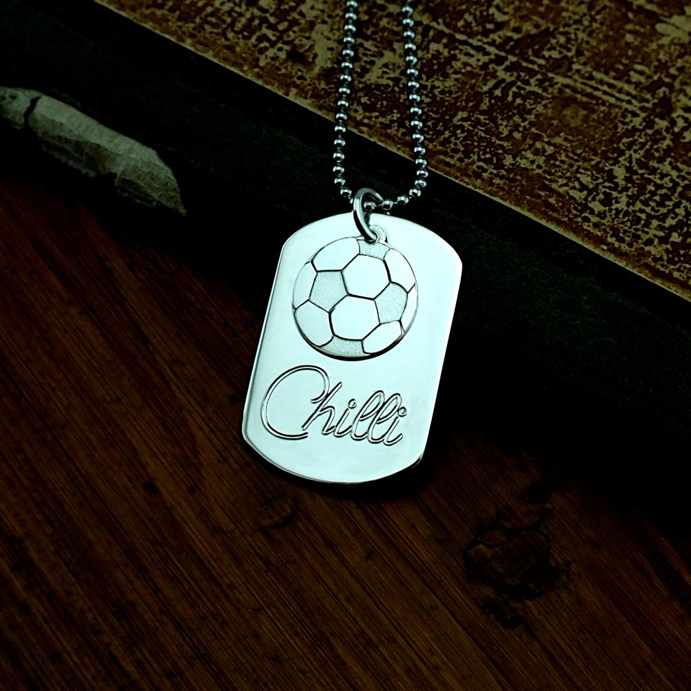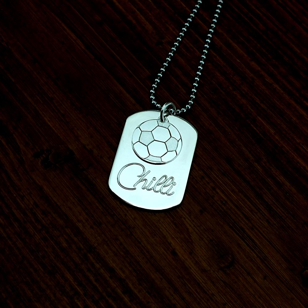Pánské psí známky vyrobeny ze stříbra ryzosti 925/1000. V lesklé povrchové úpravě s fotbalovým míčem a číslem dresu. Na destičku můžeme vyrýt i věnování. K Přívěsku je zahrnuta krabička na kterou se vejde i delší text. Veškeré požadavky nám napište do poznámky v objednávce ( třetí krok v košiku ).