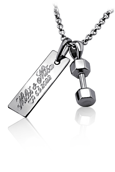 Stříbrný přívěsek, fitness činka s řetízkem, krabičkou a vaším věnováním.