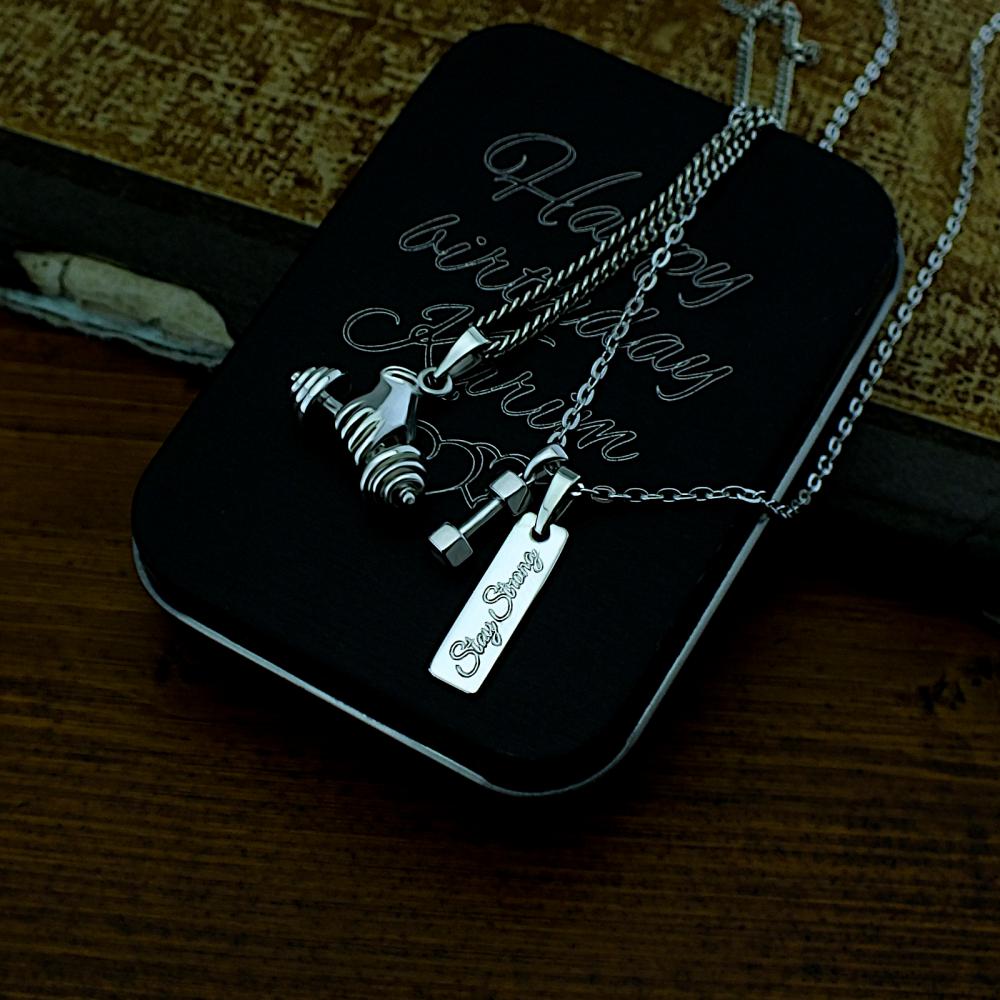 Stříbrný přívěsek, fitness činka s řetízkem, krabičkou a vaším věnováním.