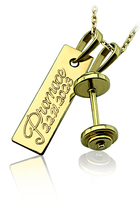 Zlatý přívěsek, fitness činka s destičkou, krabičkou a vaším věnováním.