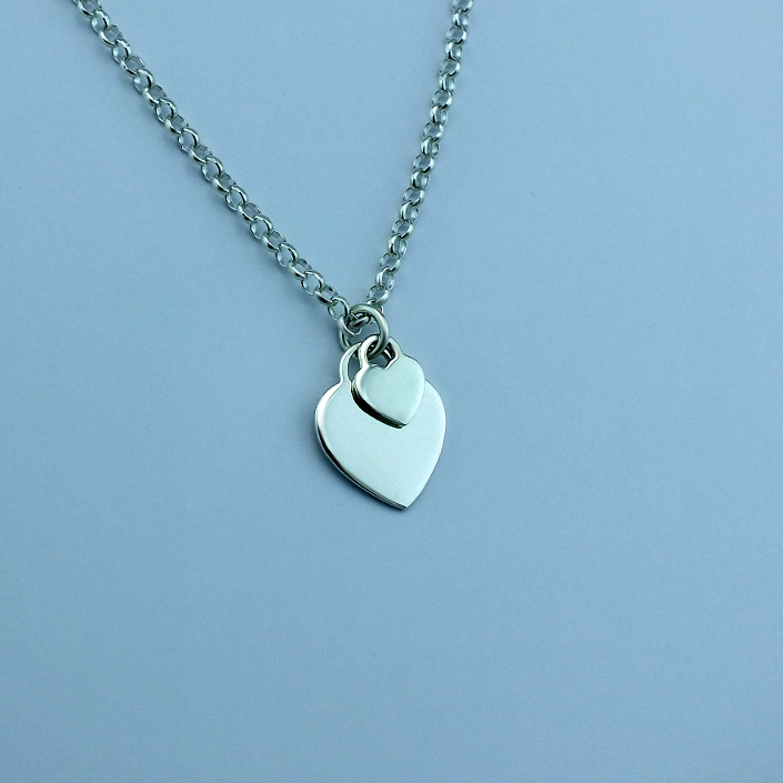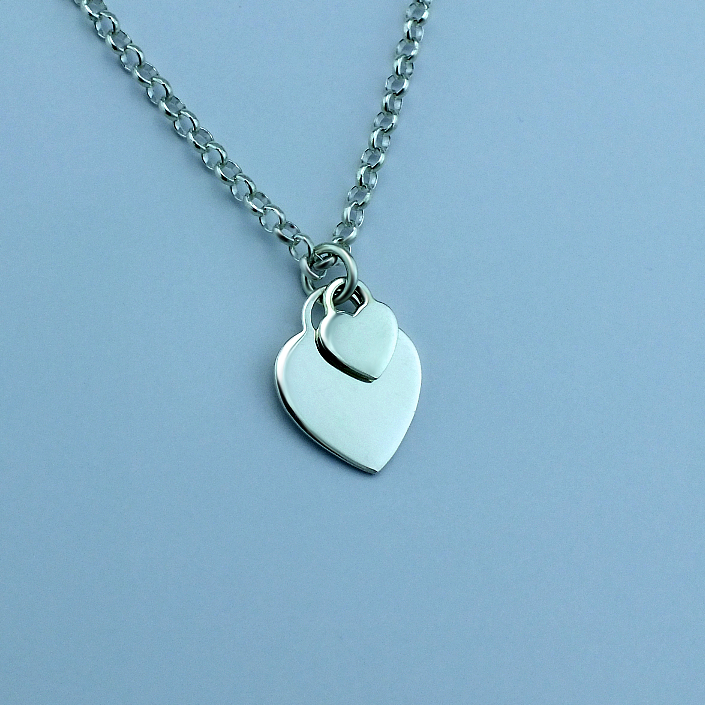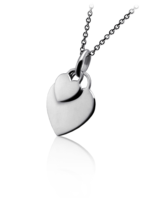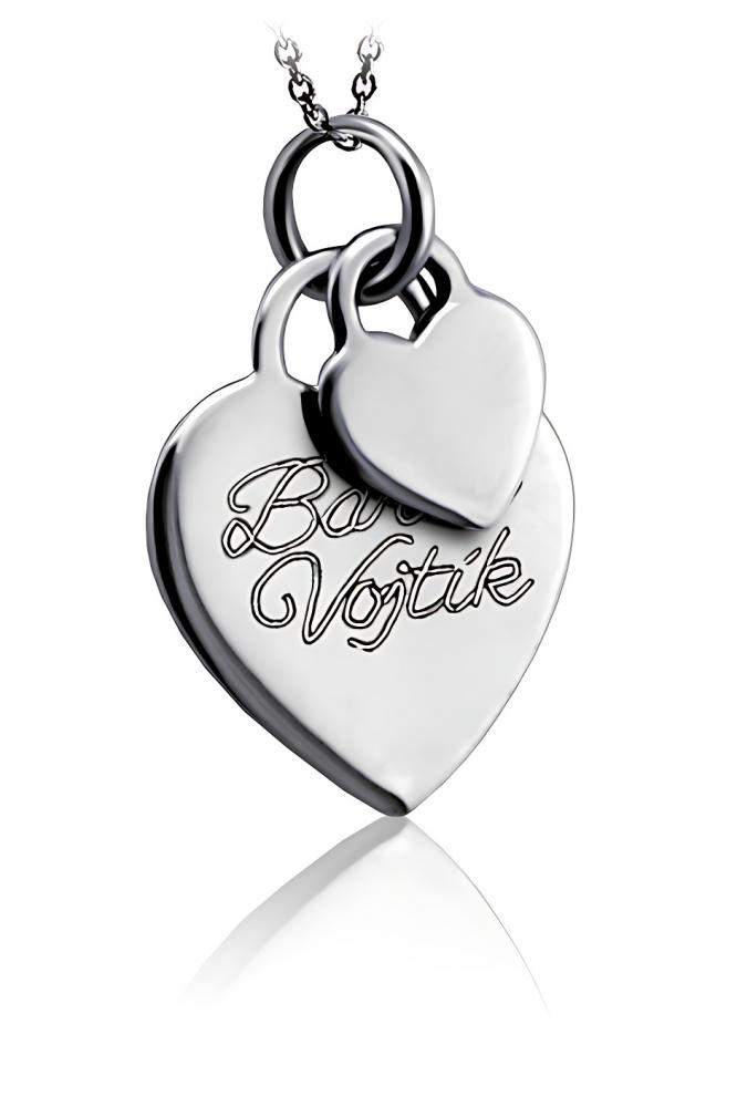 Přívěsek vyrobený ze stříbra a zdobený dvěma srdíčky. Rytí písmena nebo iniciálu je už v ceně přívěsku a mužete si zvolit lesklé rytí nebo černé. Požadovanou rytinu nám napište do poznámky v objednávce (třetí krok v košíku). K přívěsku už je zahrnuta krabička na kterou můžeme vyrýt delši text.