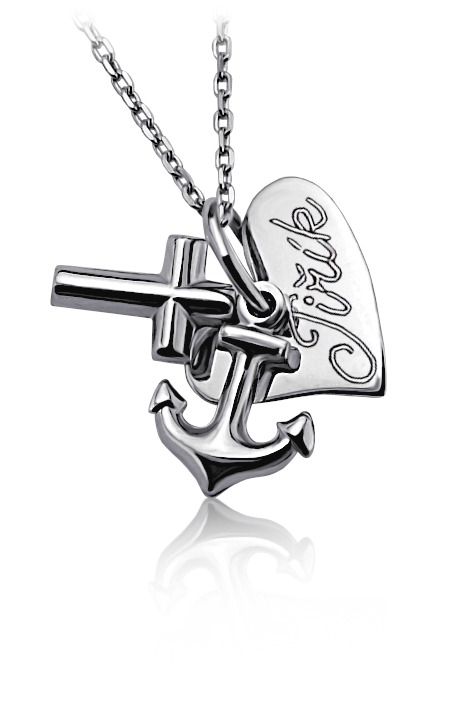 Stříbrný přivěsek zdobený rytým srdíčkem, křížkem a kotvou.
