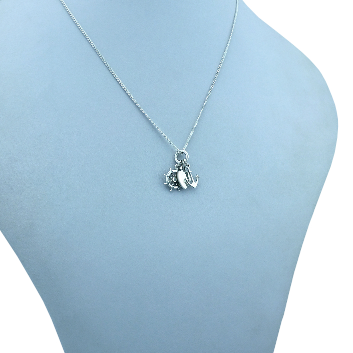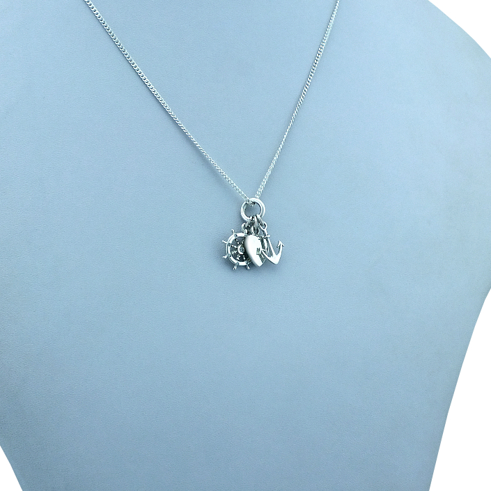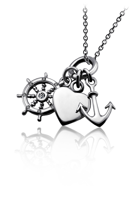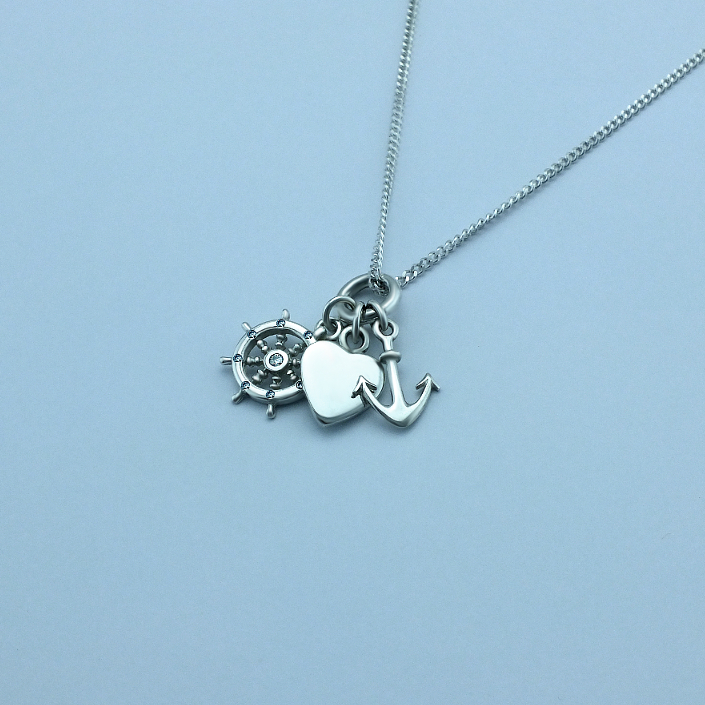 Stříbrný přivěsek zdobený rytým srdíčkem, kormidlem a kotvou. Přívěsek je vyrobený ze stříbra v lesklé povrchové úpravě. Přívěsek se skládá ze srdíčka, symbolizující lásku, kormidla který je symbolem směru, cesty a kotvy která představuje naději. Rytí písmena nebo iniciálu je už v ceně přívěsku. Požadovanou rytinu nám napište do poznámky v objednávce ( třetí krok v košíku ).
