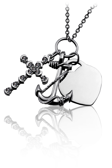 Stříbrný přivěsek zdobený rytým srdíčkem, křížkem a kotvou. Přívěsek je vyrobený ze stříbra v lesklé povrchové úpravě. Přívěsek se skládá ze srdíčka, symbolizující lásku, křížku který je symbolem víry a kotvy která představuje naději. Rytí písmena nebo iniciálu už je v ceně stříbrného přívěsku. Požadovanou rytinu nám napište do poznámky v objednávce ( třetí krok v košíku ).