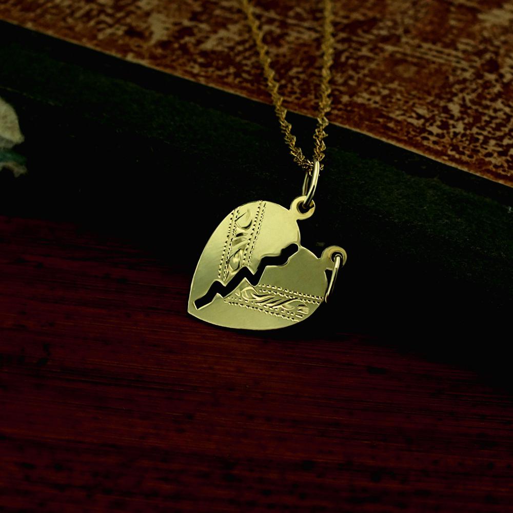 Půlené srdíčko je vyrobené ze žlutého zlata ryzosti 585/1000 v lesklé povrchové úpravě. Decentní zlatý přívěsek dekorován jemným ručním rytím. Na zadní stranu srdíčka lze vyrýt písmenka, na každou půlku jedno (přívěsek je drobný a delší text by byl nečitelný). K přívěsku už je zahrnuta dárková krabička na kterou můžeme vyrýt vaše věnování. Požadovanou rytinu nám napište do poznámky v objednávce (třetí krok v košíku).