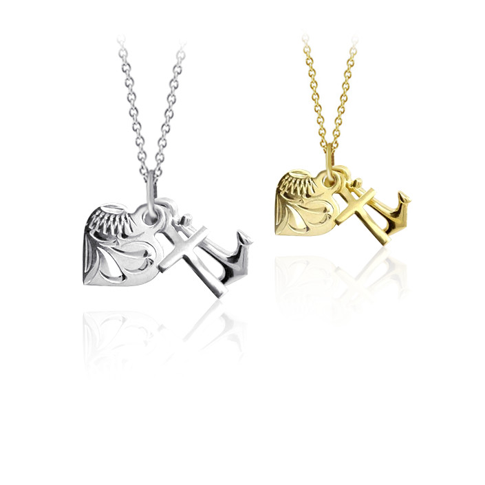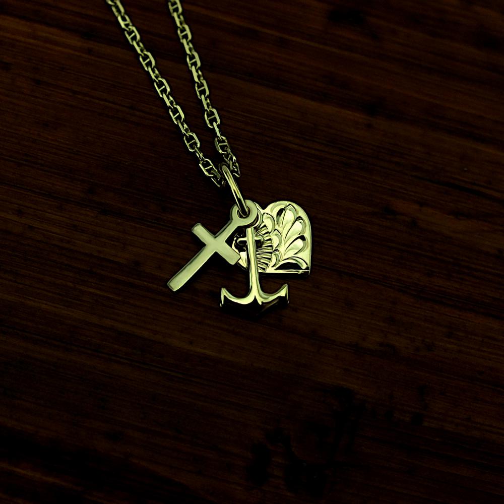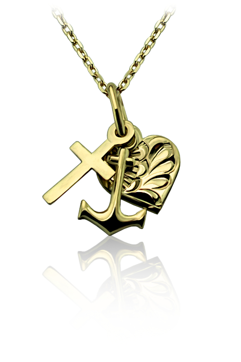 Přívěsek zdobený ručně rytým srdíčkem, křížkem a kotvou je vyrobený ze žlutého zlata ryzosti 585/1000 v lesklé povrchové úpravě. Přívěsek je možné nechat vyrobit i ze zlata bílého. Přívěsek se skládá ze srdíčka, symbolizující lásku, křížku který je symbolem víry a kotvy která představuje naději. Pokud budete chtít variantu z bílého zlata napište nám o ni do poznámky v objednávce ( třetí krok v košíku ).