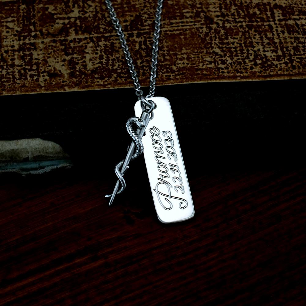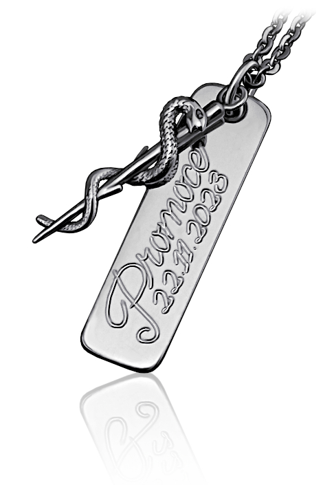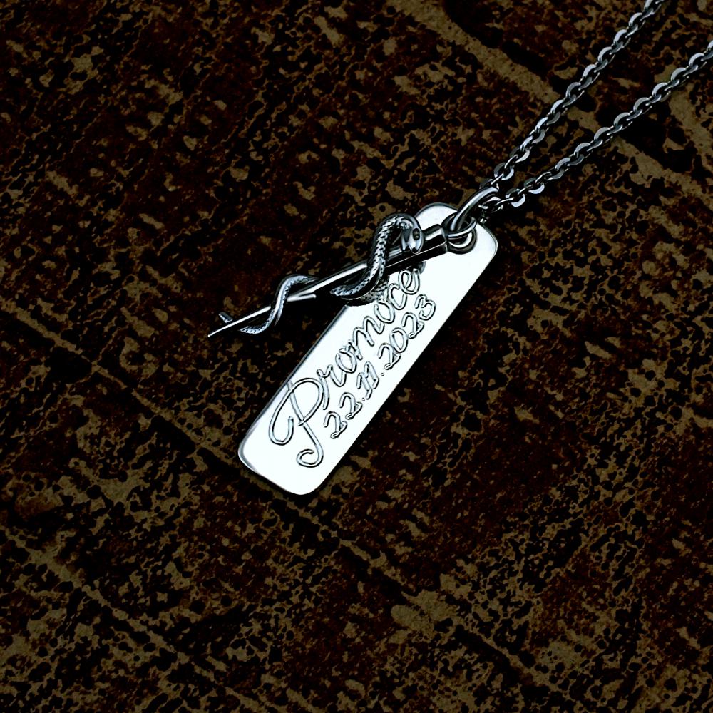 Přívěsek aeskulapova hůl je vyrobený ze stříbra ryzosti 925/1000 v lesklé povrchové úpravě. Na medailonku je vyobrazena aeskulapova hůl a zavěšena lesklá destička s možností vašeho věnování. Rytí jména, krátkého věnování nebo iniciálu je už v ceně stříbrného přívěsku. Požadovanou rytinu nám napište do poznámky v objednávce (třetí krok v košíku).