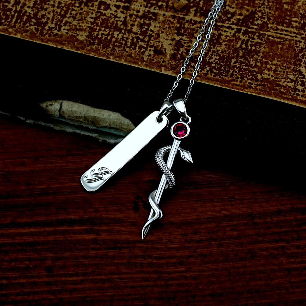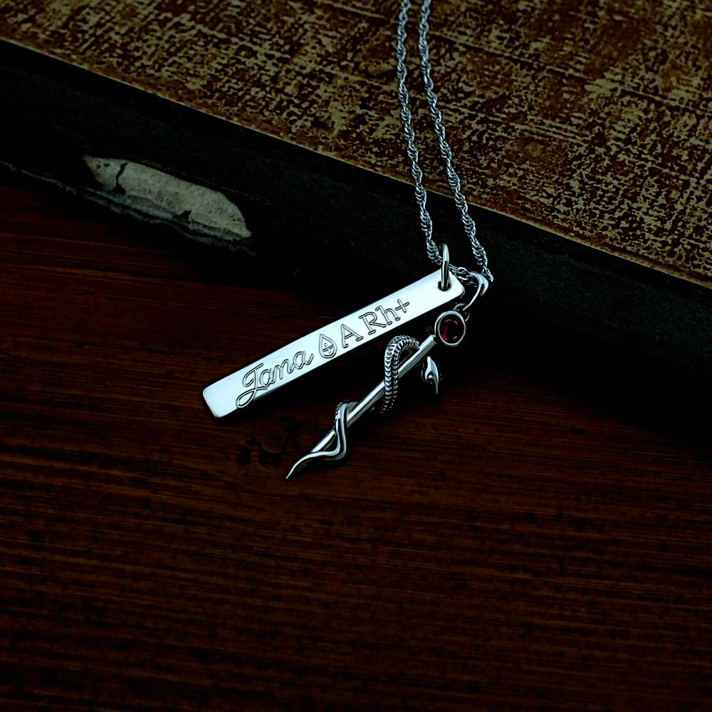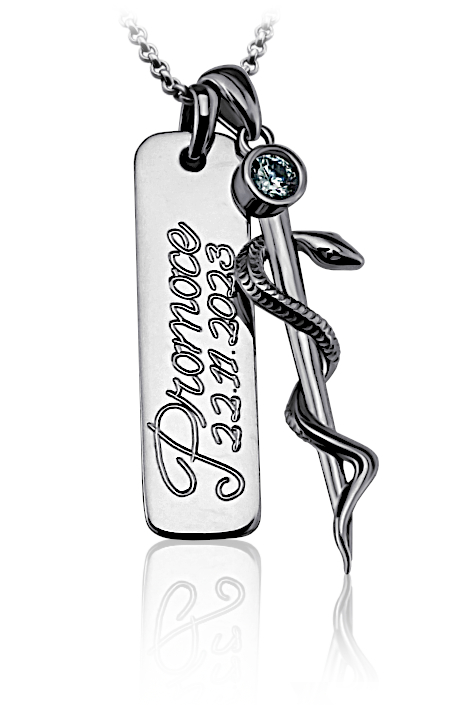 Přívěsek vyrobený ze stříbra v lesklé povrchové úpravě. Na medailonku je vyobrazena aeskulapova hůl. Přívěsek je možné zhotovit ze žlutého nebo bílého zlata, popřípadě jejich kombinace. Rytí jména nebo iniciálu je už v ceně přívěsku. Požadovanou rytinu nám napište do poznámky v objednávce (třetí krok v košíku).