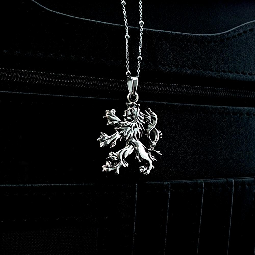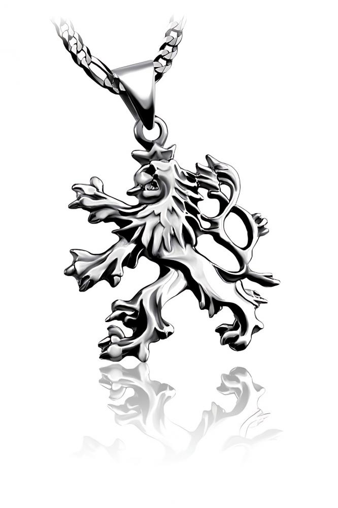 Přívěsek ve tvaru českého lva je vyrobený ze stříbra ryzosti 925/000. Český lev je ručně opracovaný přívěsek pro vlastence v lesklé povrchové úpravě. Přívěsek českého lva je moné vyrobit i v stříbrné patině popřípadě z bílého nebo lutého zlata.