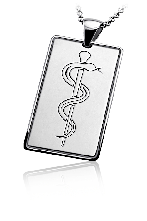 Přívěsek vyrobený ze stříbra s v lesklé povrchové úpravě. Na medailonku je vyobrazena aeskulapova hůl. Rytí věnování nebo iniciálu je už v ceně přívěsku a je možné ho vyrýt na zadní stranu. Požadovanou rytinu nám napište do poznámky v objednávce (třetí krok v košíku).