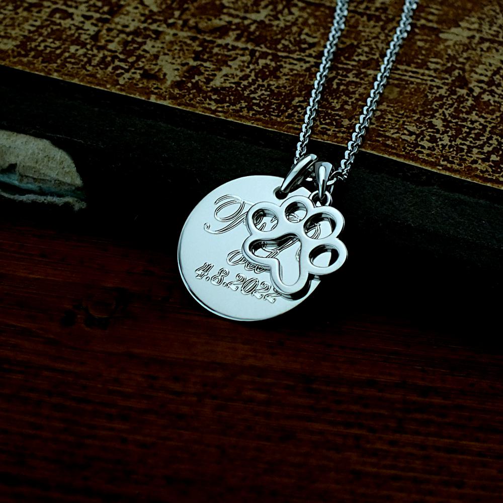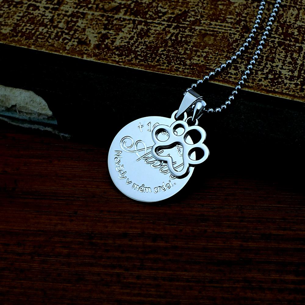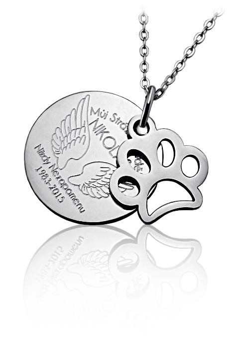 Přívěsek psí tlapka je vyroben ze stříbra v lesklé povrchové úpravě. Rytí na kolečko pod tlapkou je zcela na vás, na fotografii je pouze ilustrativní vzor. Vzhledem k menší velikosti přívěšku doporučujeme např. iniciály, jméno nebo datum. Délka textu by měla být maximálně 12 znaků (číslice, písmena, symboly) Veškeré rytí na kolečko je už zahrnuto v ceně přívěsku. Požadovanou rytinu nám napište do poznámky v objednávce (třetí krok v košíku).