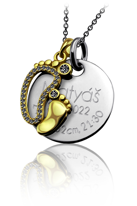 Stříbrný přivěsek zdobený dětskými stopami a kolečkem s vlastním rytím. přívěsek je vyrobený ze stříbra v lesklé povrchové úpravě a nožičky jsou zlaceny. Rytí věnování, písmena nebo iniciálu je už v ceně stříbrného přívěsku. Požadovanou rytinu nám napište do poznámky v objednávce (třetí krok v košíku).