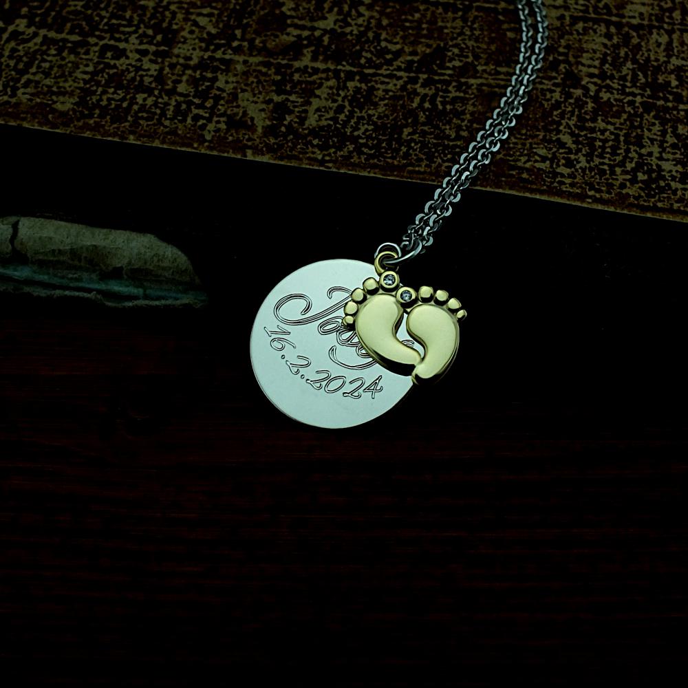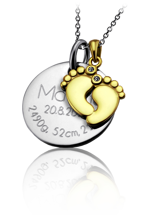 Stříbrný přivěsek zdobený dětskými stopami a kolečkem s vlastním rytím. přívěsek je vyrobený ze stříbra v lesklé povrchové úpravě a nožičky jsou zlaceny. Rytí věnování, písmena nebo iniciálu je už v ceně stříbrného přívěsku. Požadovanou rytinu nám napište do poznámky v objednávce (třetí krok v košíku).