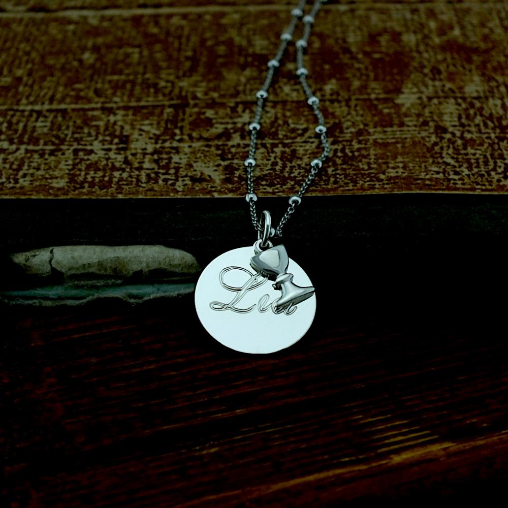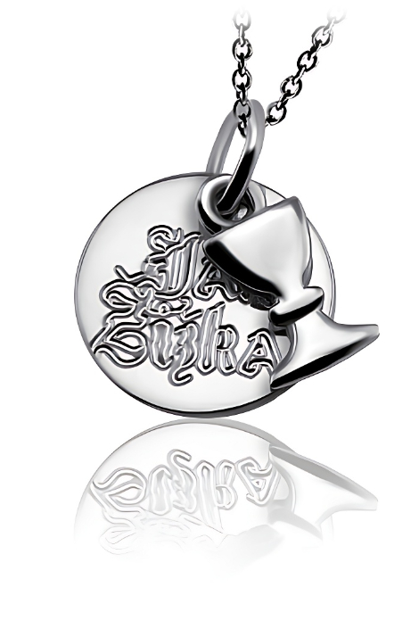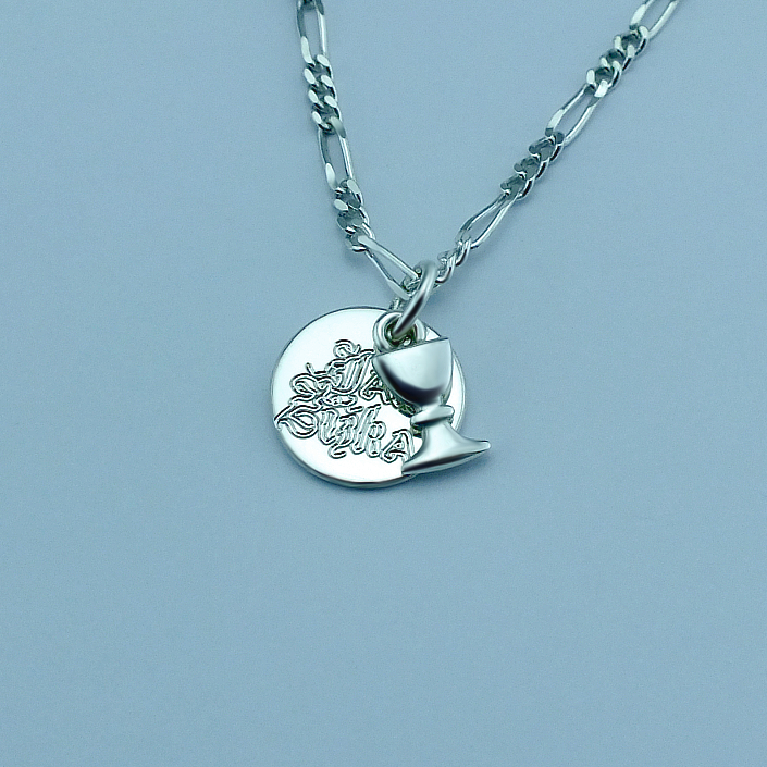Stříbrný přívěsek zdobený husitským kalichem a hladkým kolečkem. Přívěsek je vyrobený ze stříbra ryzosti 925/1000 v lesklé povrchové úpravě. Rytí na kolečko je zcela na vás, na fotografii je pouze ilustrativní vzor. Na zadní stranu můžeme vyrýt další text dle vašeho přání. Veškeré rytí na kolečko je už zahrnuto v ceně přívěsku. Požadovanou rytinu nám napište do poznámky v objednávce ( třetí krok v košíku ).