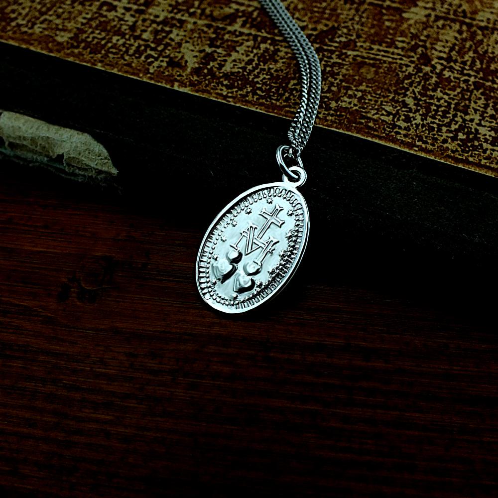 Oboustranný medailonek v přední části zobrazuje Matku Boží a na zadní straně se nachází kříž propletený s písmenem M (M jako Maria). Pod tímto symbolem je Božské Srdce Ježíšovo a Srdce Panny Marie.