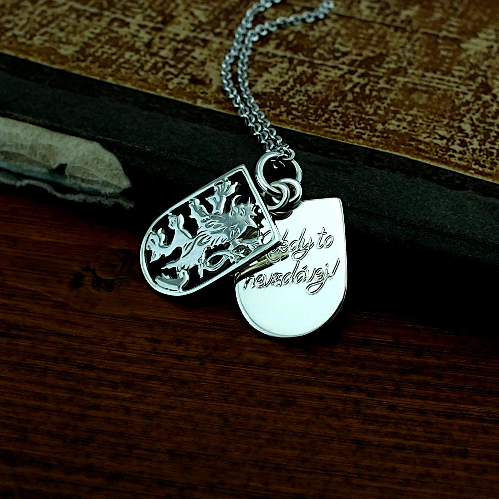 Stříbrný přívěsek zdobený českým lvem a hladkou destičkou. Přívěsek je vyrobený ze stříbra ryzosti 925/1000 v lesklé povrchové úpravě. Rytí na destičku je zcela na vás, na fotografii je pouze ilustrativní vzor. Na zadní stranu můžeme vyrýt další text dle vašeho přání. Veškeré rytí na destičku je už zahrnuto v ceně přívěsku. Požadovanou rytinu nám napište do poznámky v objednávce ( třetí krok v košíku ).