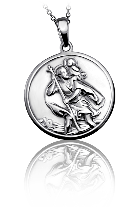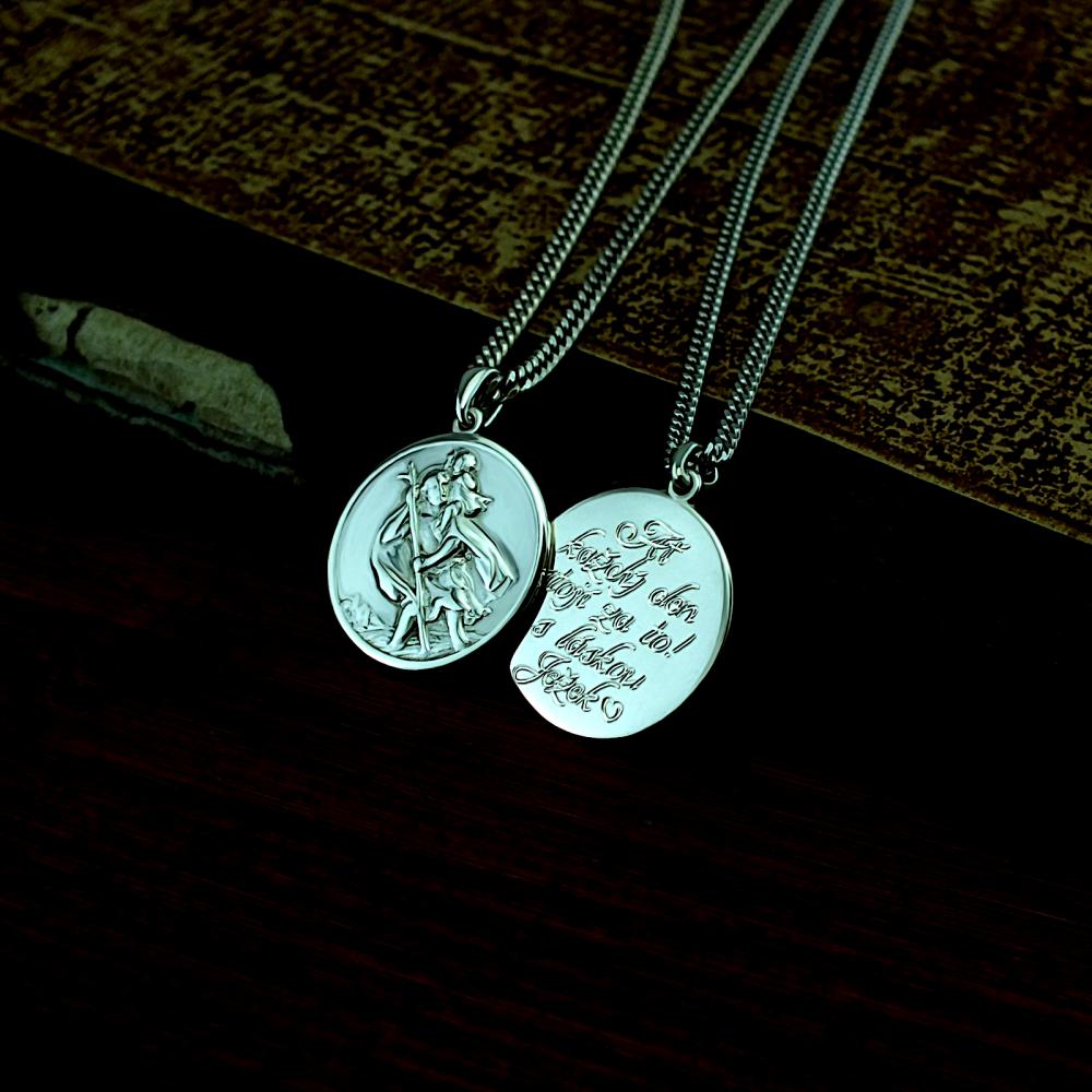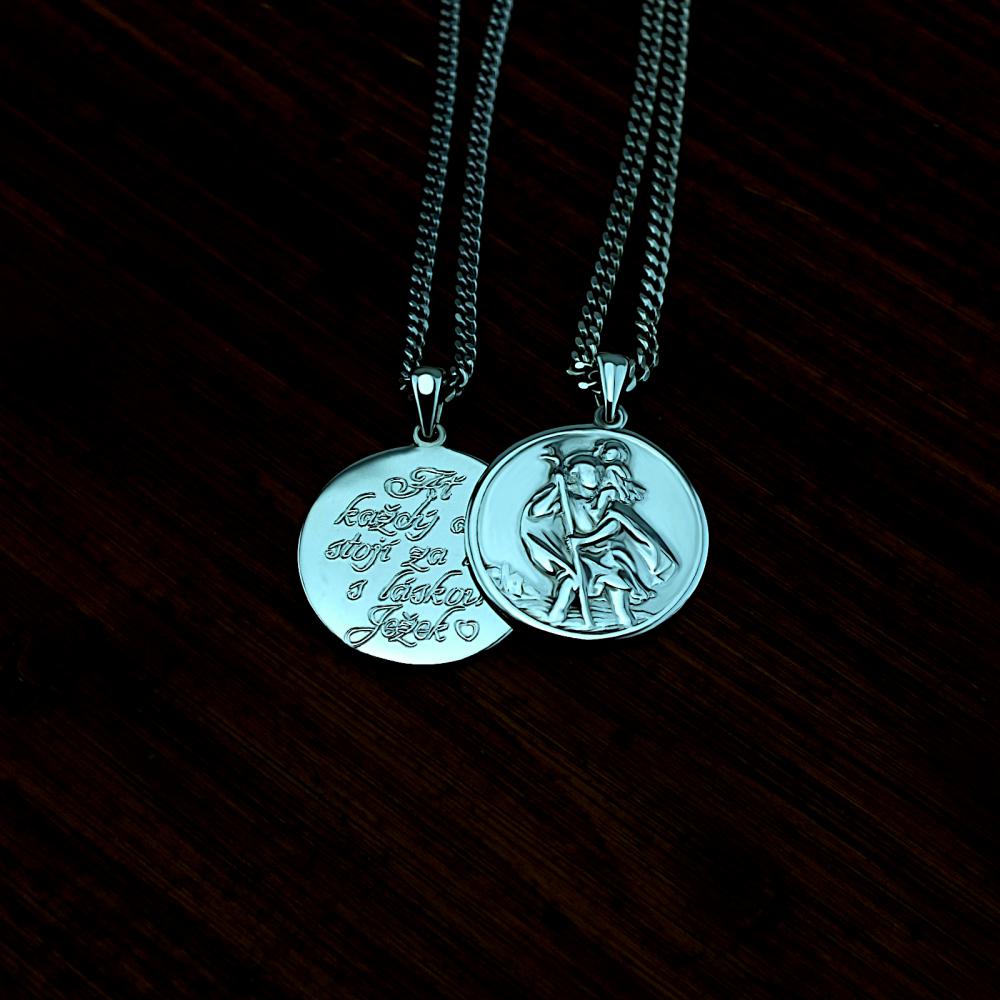 Přívěsek vyrobený ze stříbra s ražbou Svatého Kryštofa v lesklé povrchové úpravě. Na medailonku je vyobrazen Svatý Kryštov opírající se o hůl a nesoucí na ramenou Ježíška. Svatý Kryštov je patronem cestovatelů a řidičů, poskytuje ochranu při cestě životem. Na zadní stranu přívěsku je možné nechat vyrýt věnování, které je už v ceně přívěsku. Požadovanou rytinu nám napište do poznámky v objednávce (třetí krok v košíku).