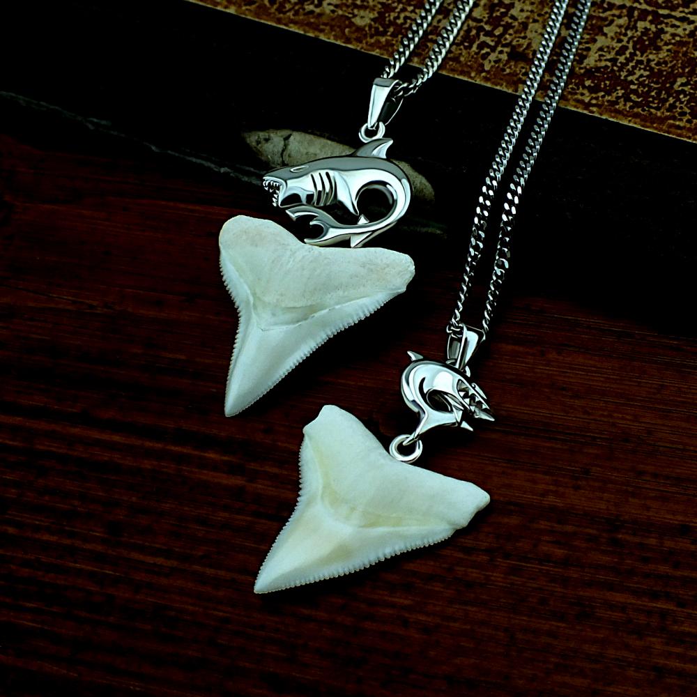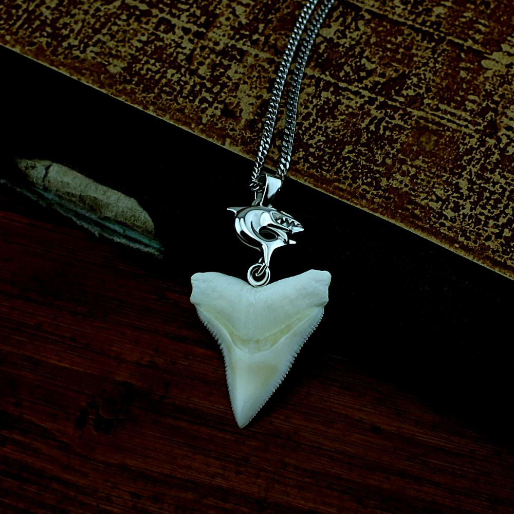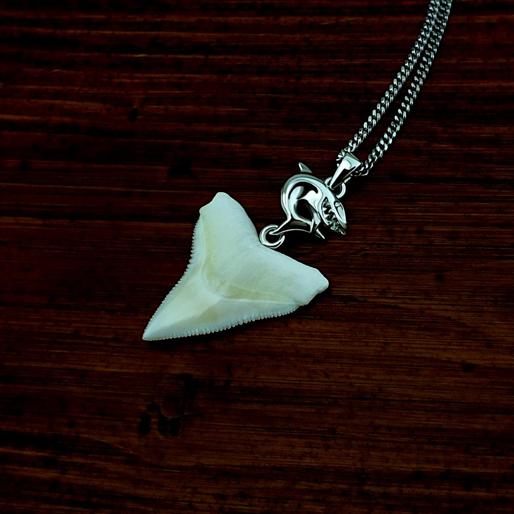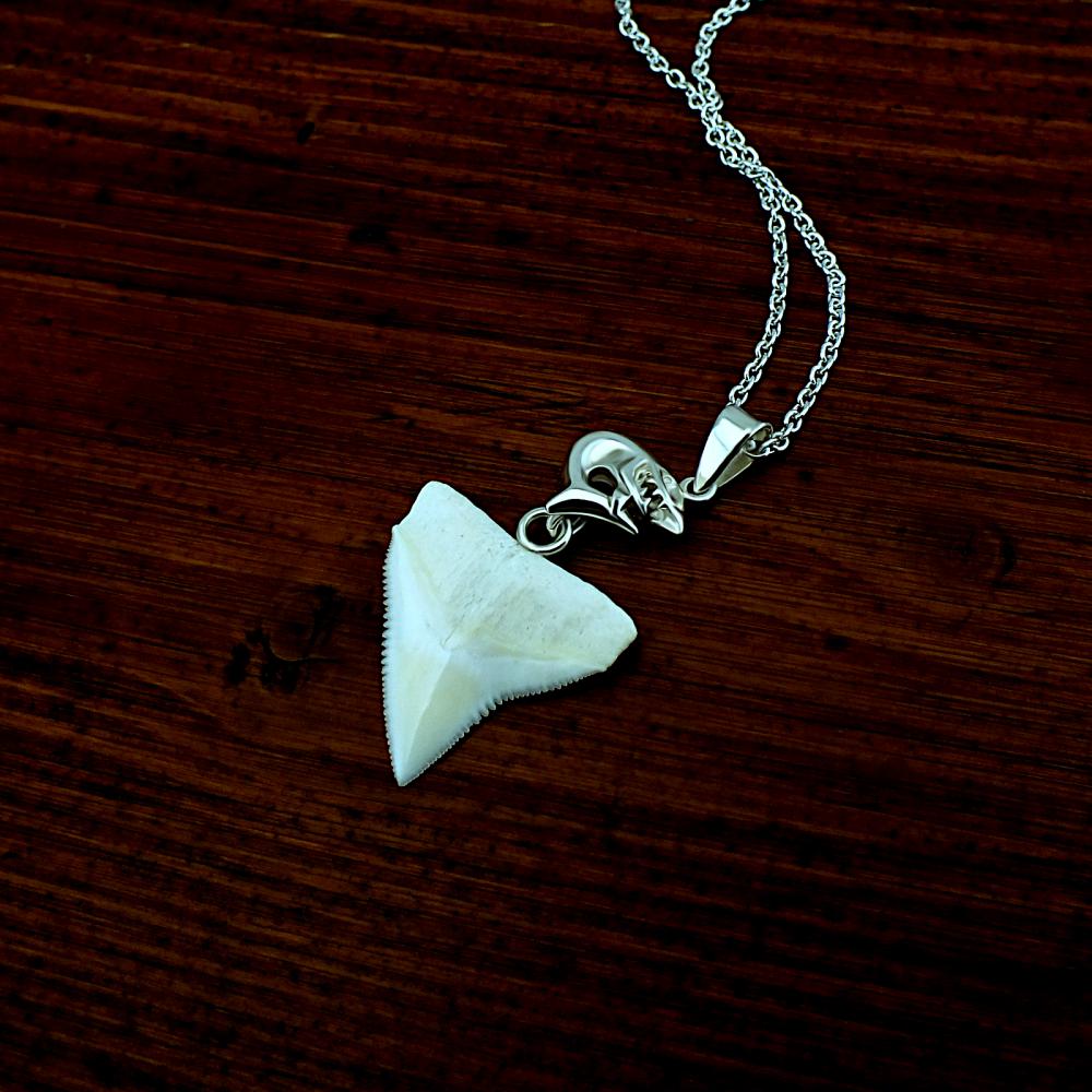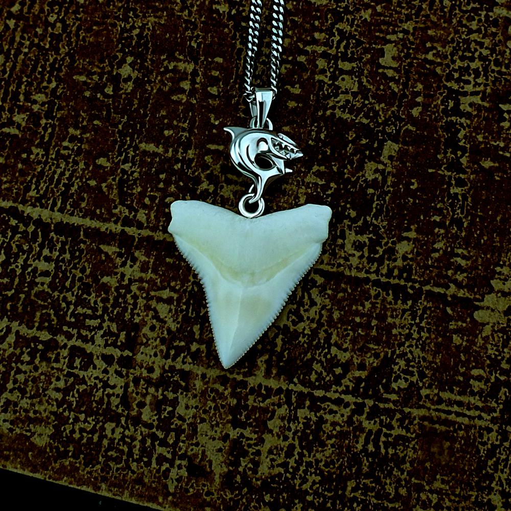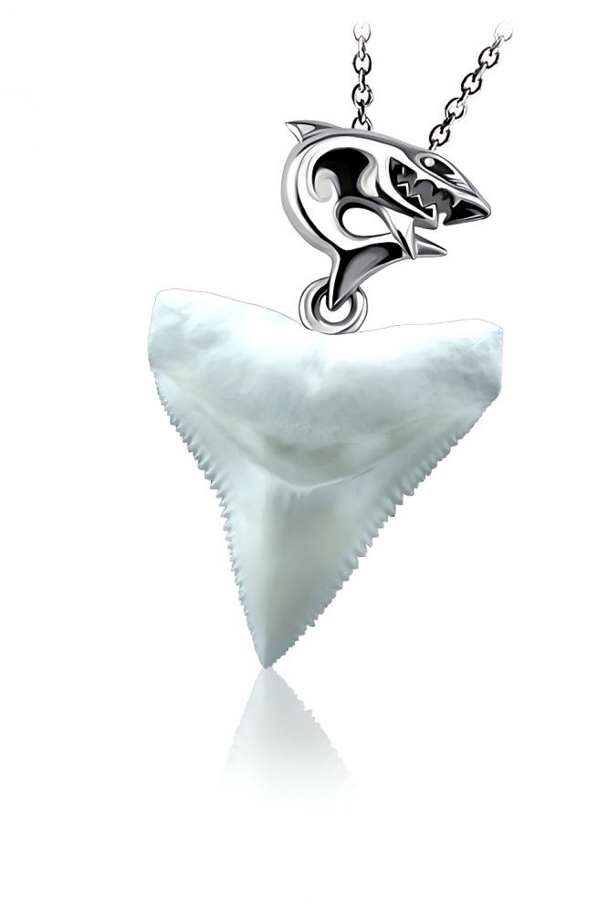 Stříbrný přívěsek raloka ryzosti 925/1000 v lesklé povrchové úpravě a zdobený raločím zubem. Zub raloka bělavého pochází z horní, nebo střední části čelisti a jeho velikost je přiblině 2cm. Jedná se o pravý zub raloka bělavého proto se mohou jednotlivé rozměry mírně liit. Závěsné očko a řetízek jsou vyrobeny ze stŕíbra. Délka řetízku je 50 cm, co je běná pánská velikost. Pokud budete chtít jinou délku napite nám o ni do poznámky v objednávce (třetí krok v koíku).