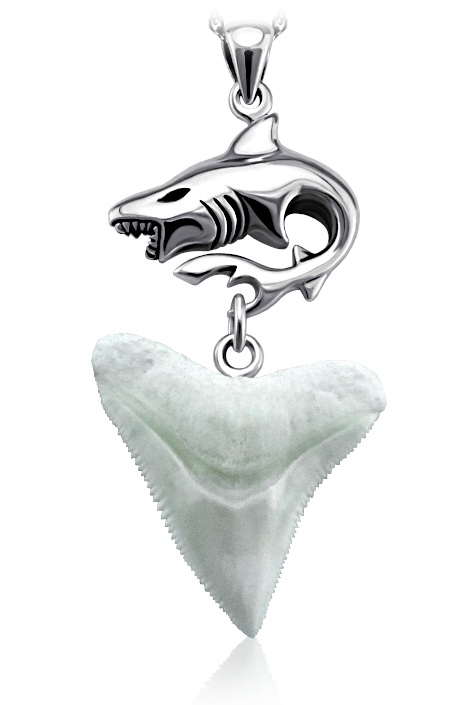 Stříbrný přívěsek raloka ryzosti 925/1000 v lesklé povrchové úpravě a zdobený raločím zubem. Zub raloka bělavého pochází z horní, nebo střední části čelisti a jeho velikost je přiblině 25mm. Jedná se o pravý zub raloka bělavého proto se mohou jednotlivé rozměry mírně liit. Závěsné očko a ozdobný ralok jsou vyrobeny ze stŕíbra.