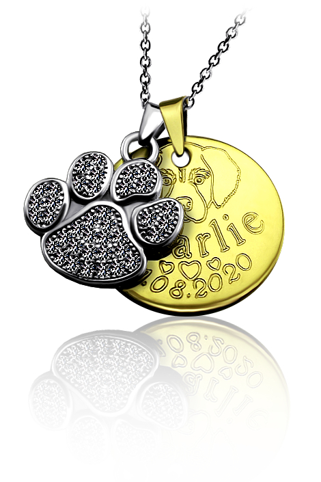 Zlatý přívěsek, ve tvaru kolečka na vaše rytí. Přívěsek je vyrobený ze žlutého zlata ryzosti 585/1000 v lesklé povrchové úpravě. Rytí jmen nebo věnování na kolečku je zcela na vás, na fotografii je pouze ilustrativní vzor (lze vyrýt max. dvě, tři slova). Ke zlatému kolečku je přivěsek ve tvaru psí tlapky vyrobený ze stříbra a osázena kamínky. Veškeré rytí na zlaté kolečko je už zahrnuto v ceně přívěsku. Požadovanou rytinu nám napište do poznámky v objednávce (třetí krok v košíku).