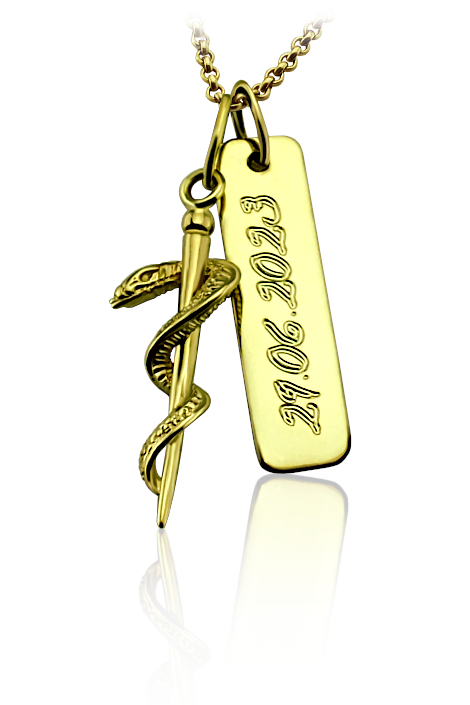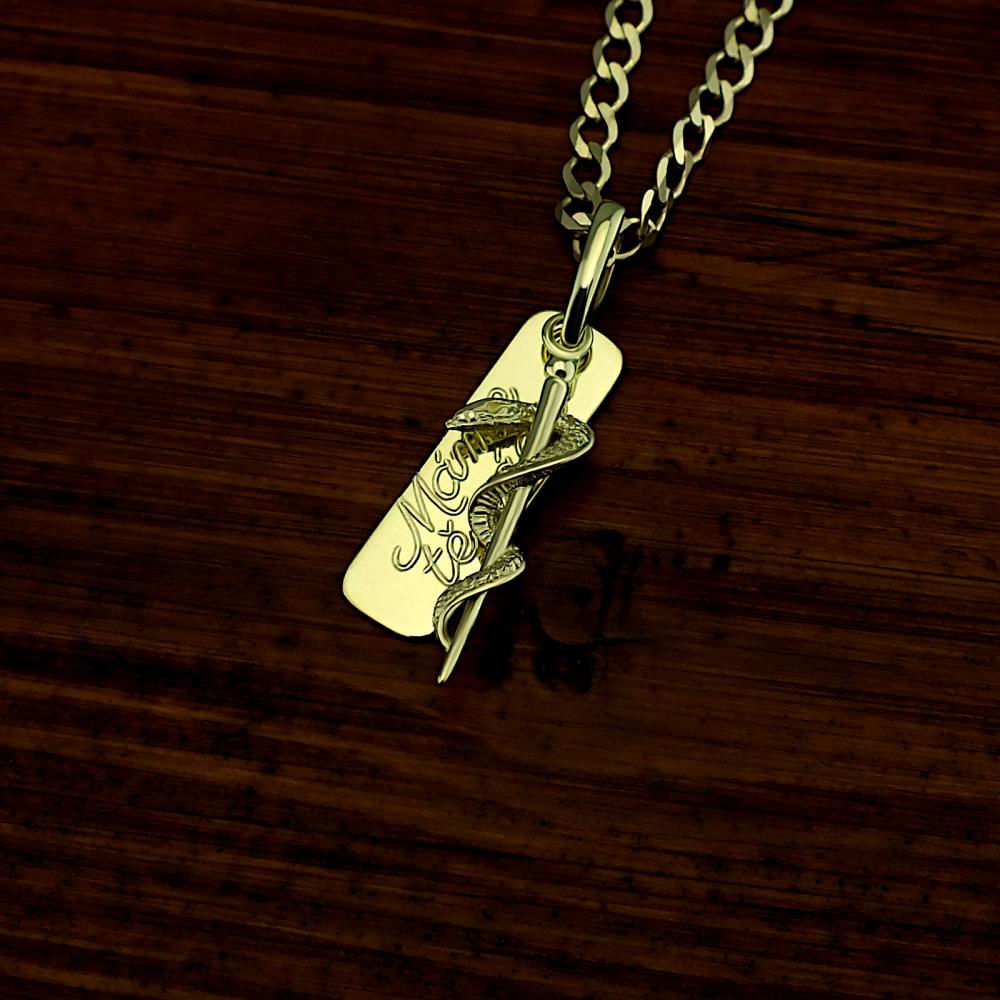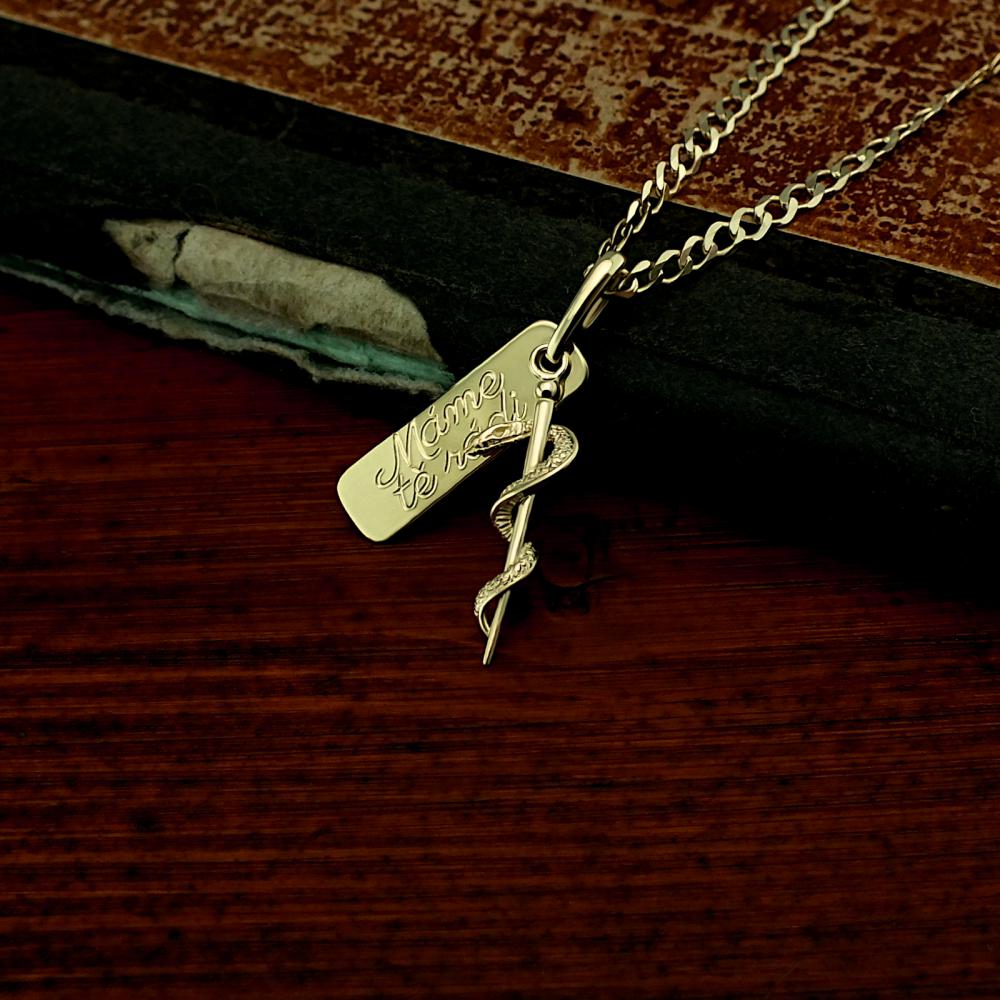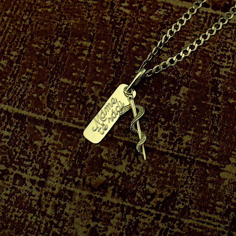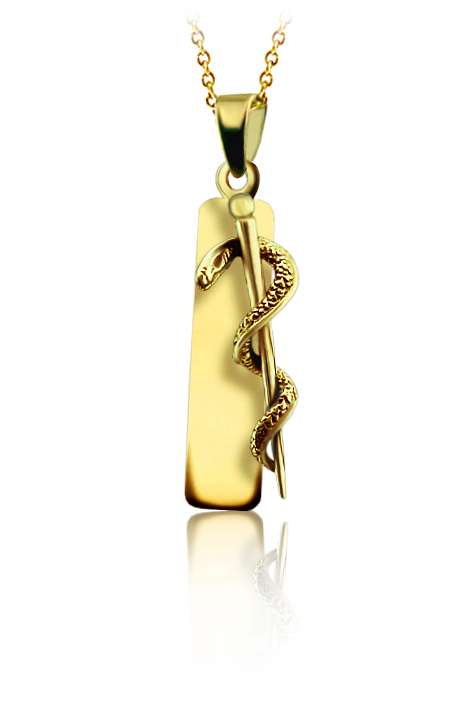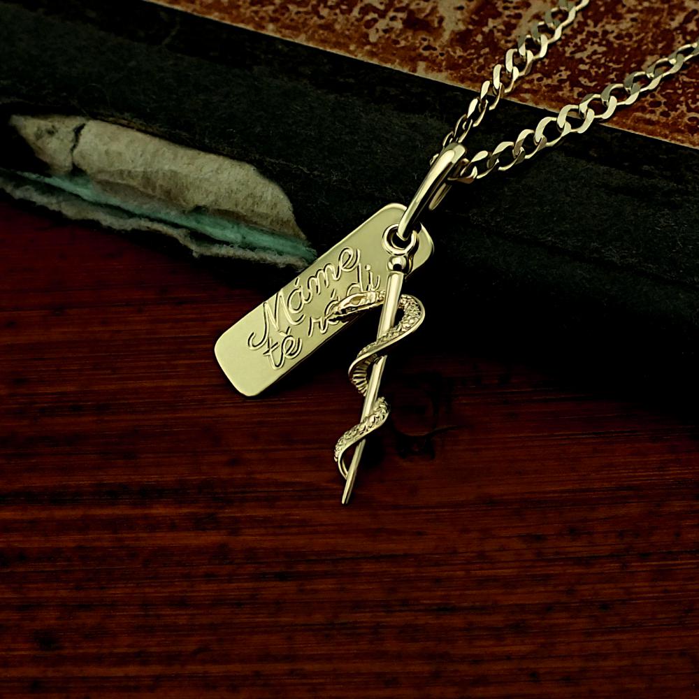Přívěsek vyrobený ze žlutého zlata v lesklé povrchové úpravě. Na přívěsku s destičkou je zavěšena aeskulapova hůl. Přívěsek je možné vyrobit i z bílého zlata, popřípadě jejich kombinace (cena zůstává stejná) Rytí jména nebo iniciálu je už v ceně přívěsku. Požadovanou rytinu nám napište do poznámky v objednávce (třetí krok v košíku).