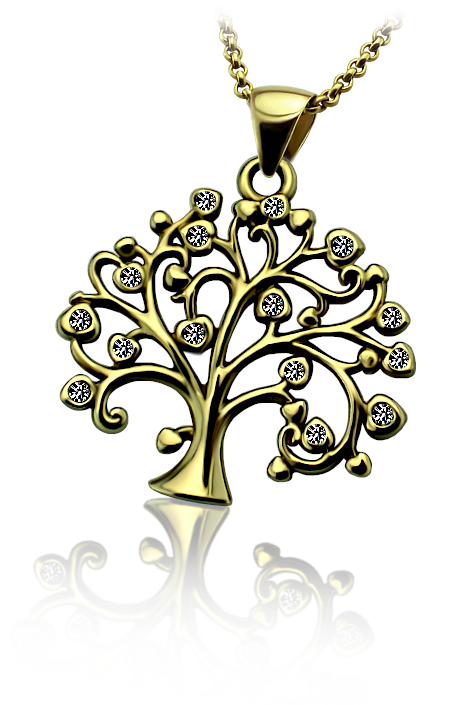 Přívěsek strom života je vyrobený ze žlutého zlata, zdobený zirkony.