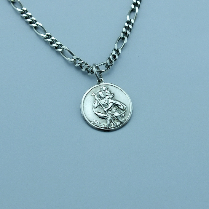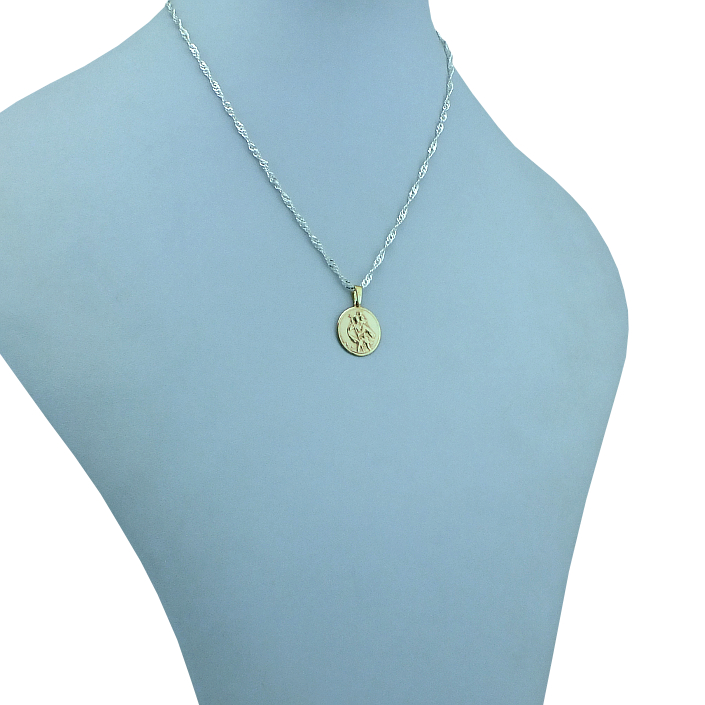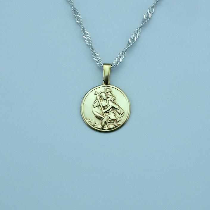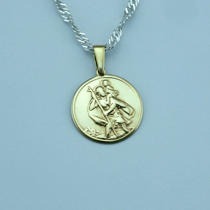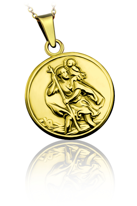Přívěsek vyrobený ze žlutého zlata s ražbou Svatého Kryštofa v lesklé povrchové úpravě. Na medailonku je vyobrazen Svatý Kryštov opírající se o hůl a nesoucí na ramenou Ježíška. Svatý Kryštov je patronem cestovatelů a řidičů, poskytuje ochranu při cestě životem. Na zadní stranu přívěsku je možné nechat vyrýt věnování, které je už v ceně přívěsku. Přívěsek Svatého Kryštofa je možné nechat vyrobit i z bílého zlata. Požadovanou rytinu, popřípadě jinou barvu zlata nám napište do poznámky v objednávce (třetí krok v košíku).