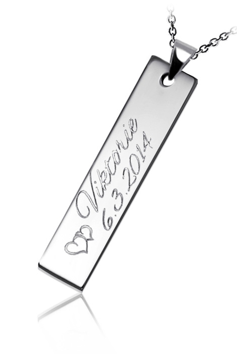 Přívěsek je vyrobený z oceli a zdobený vlastním rytím. Rytí jména nebo iniciálu je už v ceně ocelového přívěsku. K přívěsku je už zahrnut řetízek a dárková krabička na kterou můžeme vyrýt delši věnování. Požadovanou rytinu nám napište do poznámky v objednávce (třetí krok v košíku).