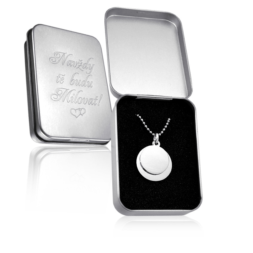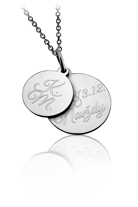 Přívěsek je vyrobený z leštěné oceli a zdobený vlastním rytím. Rytí jména nebo iniciálu je už v ceně přívěsku. K ocelovému přívěsku je už zahrnut řetízek a dárková krabička na kterou můžeme vyrýt delši věnování. Požadovanou rytinu nám napište do poznámky v objednávce (třetí krok v košíku).