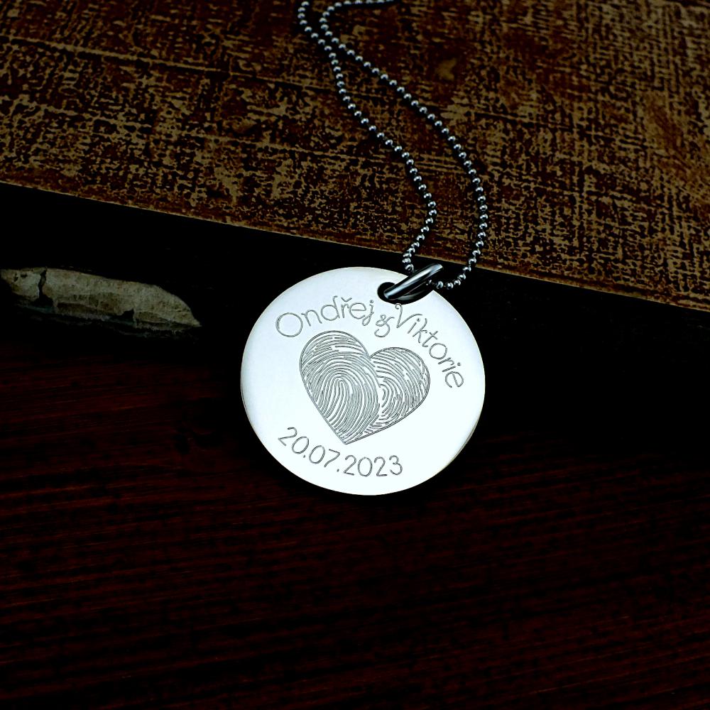 Přívěsek je vyrobený z oceli a zdobený vlastním rytím. Rytí jména nebo iniciálu je už v ceně přívěsku. K přívěsku je už zahrnut řetízek a dárková krabička na kterou můžeme vyrýt delši věnování. Požadovanou rytinu nám napište do poznámky v objednávce (třetí krok v košíku).