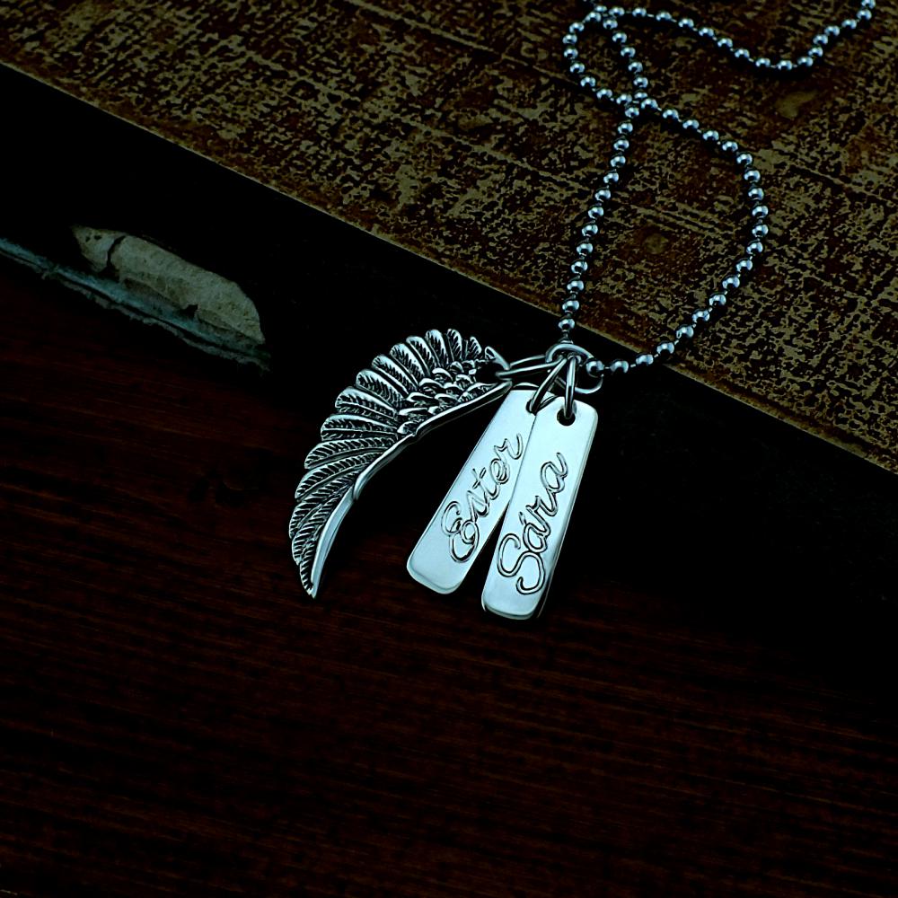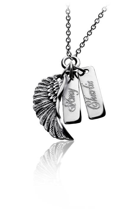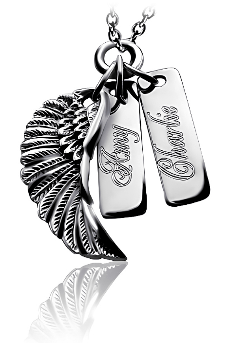 Přívěsek vyrobený ze stříbra ryzoti 925/1000 v lesklé povrchové úpravě zdobený destičkami a andělským křidlem. Rytí na destičku je zcela na vás, na fotografii je pouze ilustrativní vzor. Na zadní stranu můžeme vyrýt další text dle vašeho přání. Veškeré rytí na destičky už je zahrnuto v ceně přívěsku. Požadovanou rytinu nám napište do poznámky v objednávce (třetí krok v košíku).