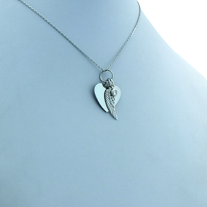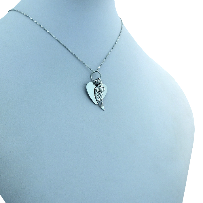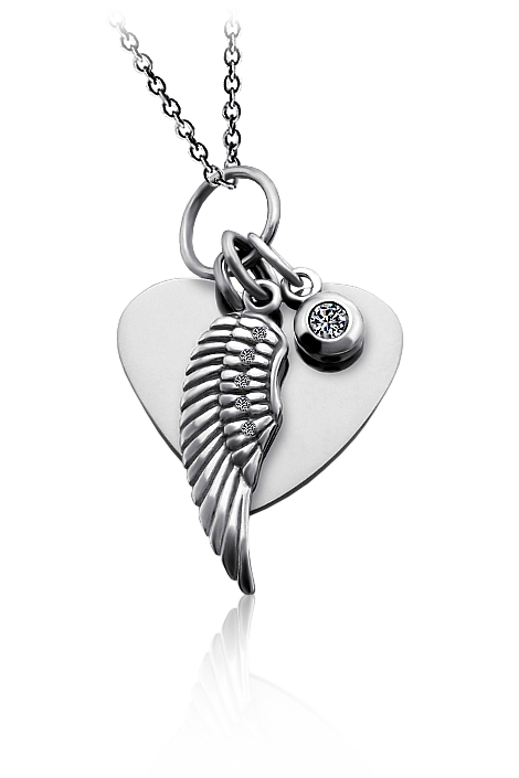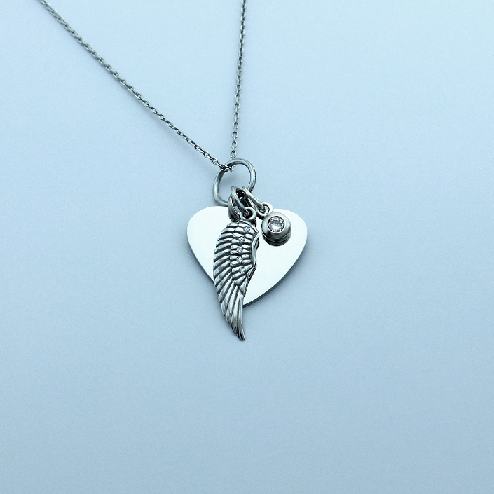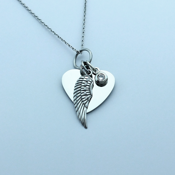 Přívěsek vyrobený ze stříbra ryzoti 925/1000 v lesklé povrchové úpravě zdobený srdíčkem a andělským křidlem. Rytí na srdíčku je zcela na vás, na fotografii je pouze ilustrativní vzor. Na zadní stranu můžeme vyrýt další text dle vašeho přání. Veškeré rytí na srdíčku už je zahrnuto v ceně přívěsku. Požadovanou rytinu nám napište do poznámky v objednávce (třetí krok v košíku).