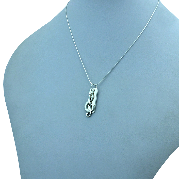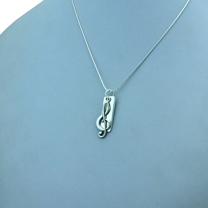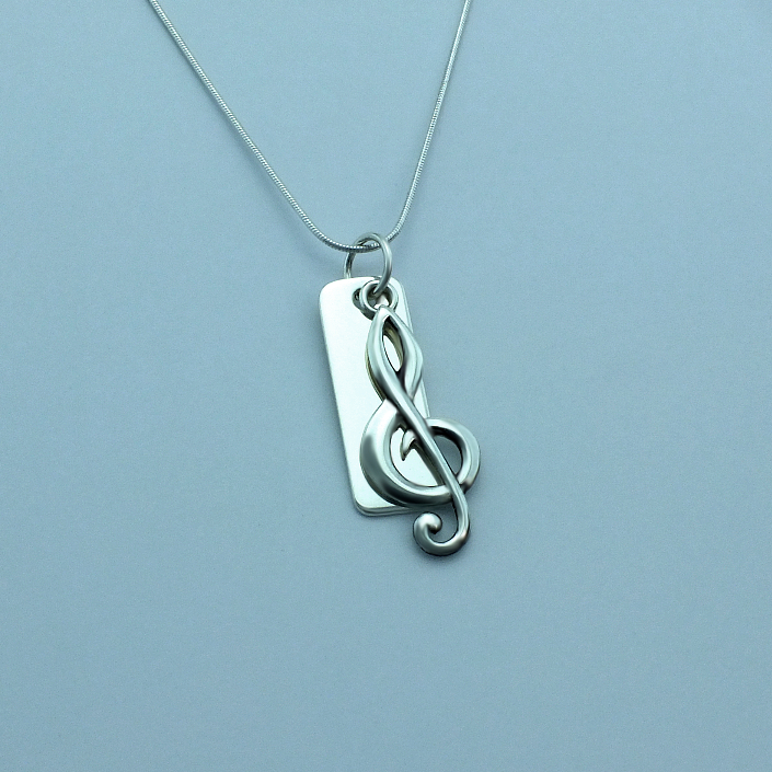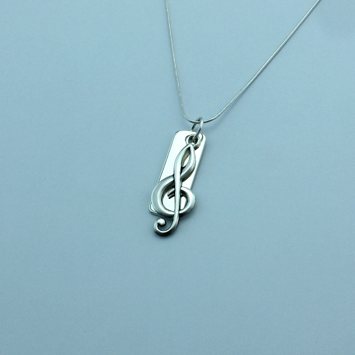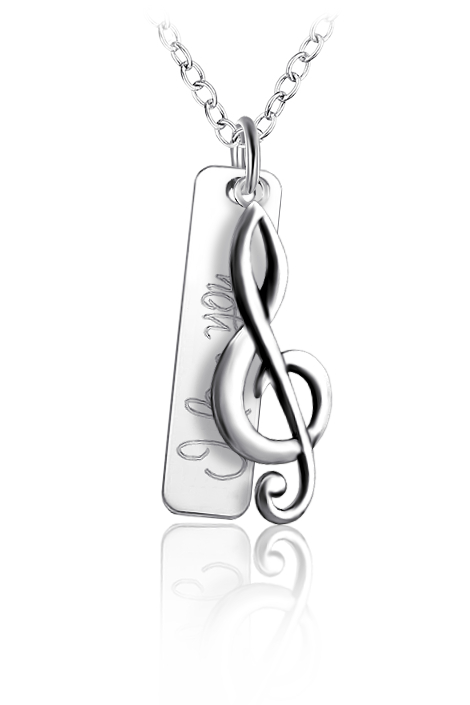 Stříbrný přívěsek zdobený houslovým klíčem a hladkou destičkou. Přívěsek je vyrobený ze stříbra ryzosti 925/1000 v lesklé povrchové úpravě. Rytí na destičku je zcela na vás, na fotografii je pouze ilustrativní vzor. Na zadní stranu můžeme vyrýt další text dle vašeho přání. Veškeré rytí na destičku je už zahrnuto v ceně přívěsku. Požadovanou rytinu nám napište do poznámky v objednávce ( třetí krok v košíku ).