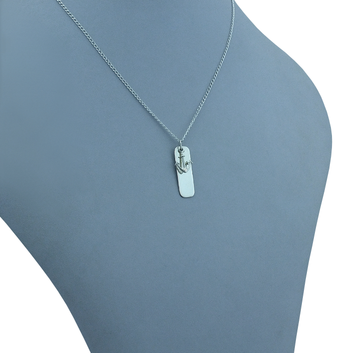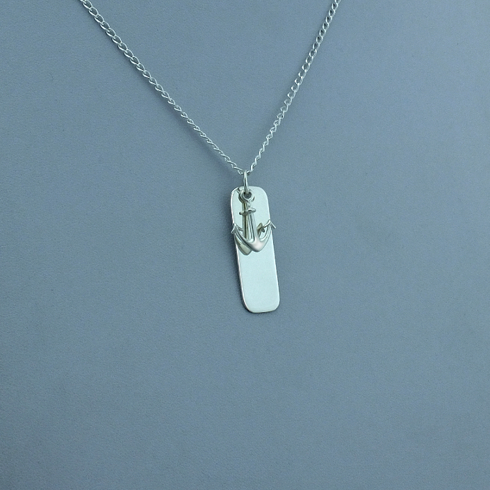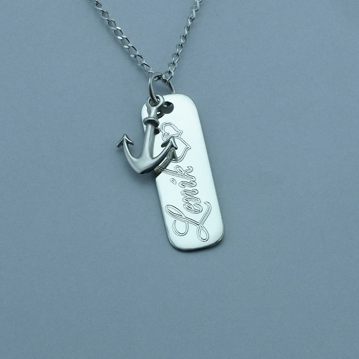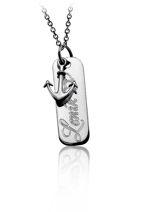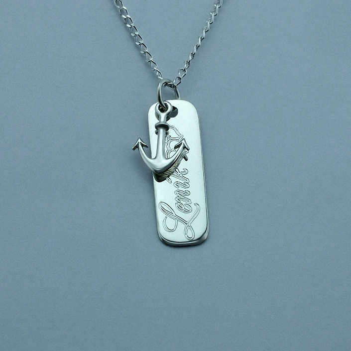 Stříbrný přivěsek zdobený kotvou a destičkou. Přívěsek je vyrobený ze stříbra v lesklé povrchové úpravě ryzosti 925/1000. Rytí jména nebo věnování je už v ceně přívěsku. Požadovanou rytinu nám napište do poznámky v objednávce ( třetí krok v košíku ).