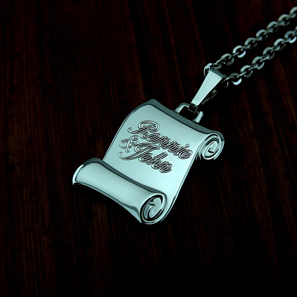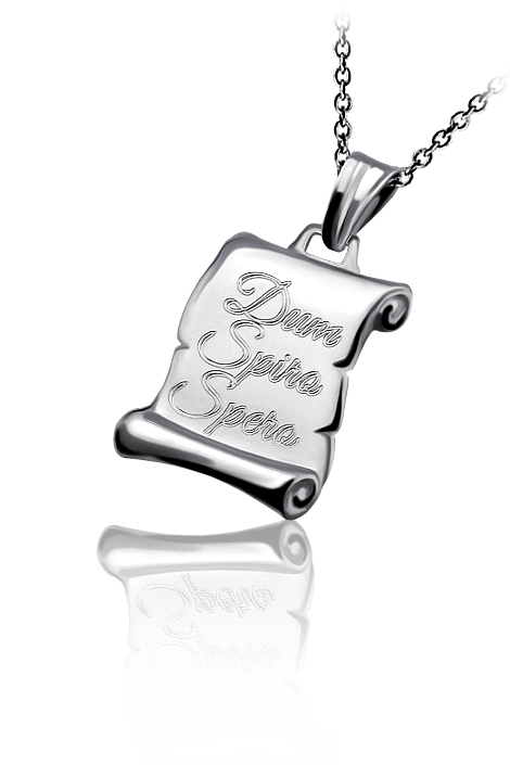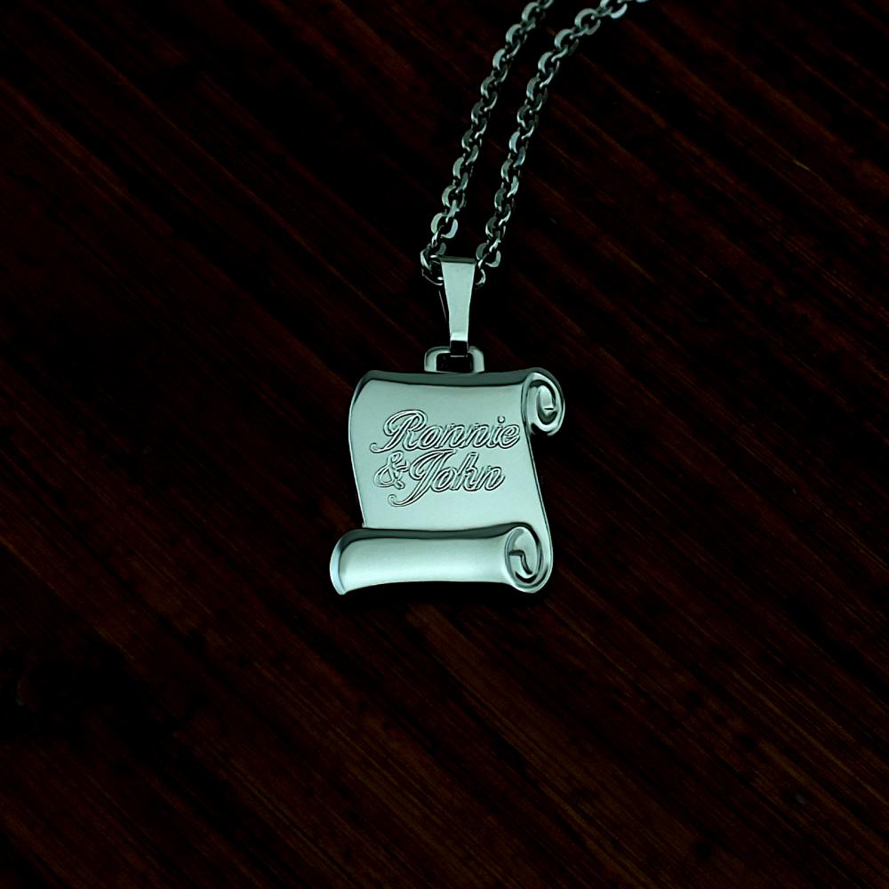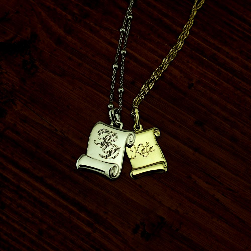 Decentní stříbrný přívěsek dekorován vlastím rytím, ryzosti 925/1000 v leklé povrchové úpravě. Na přívěsek je možné nechat vyrýt iniciály nebo krátké věnování. Rytí na pergamen je už v ceně přívěsku, na fotografii je pouze ilustrativní vzor. Požadované rytí nám napište do poznámky v objednávce (třetí krok v košíku).