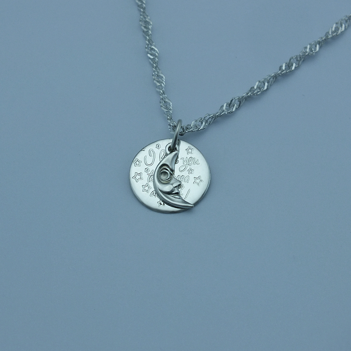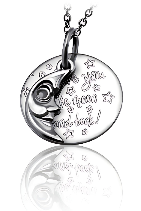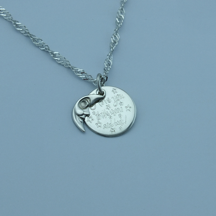 Stříbrný přívěsek zdobený měsícem a kolečkem vyrobený v ryzosti 925/1000. Přívěsek je vyrobený ze stříbra v lesklé povrchové úpravě. Rytí na kolečku je poze ilustrativní a je možné ho změnit. Požadovanou rytinu nám napište do poznámky v objednávce ( třetí krok v košíku ).