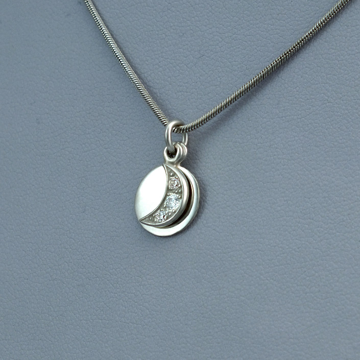 Stříbrný přivěsek zdobený půlměsícem a kolečkem, ryzosti 925/1000. Vyrobený ze stříbra v lesklé povrchové úpravě a zdobený zirkony. Rytí písmena nebo iniciálu je už v ceně přívěsku. Požadovanou rytinu nám napište do poznámky v objednávce (třetí krok v košíku).