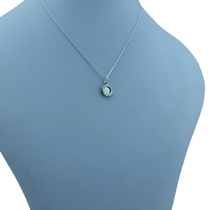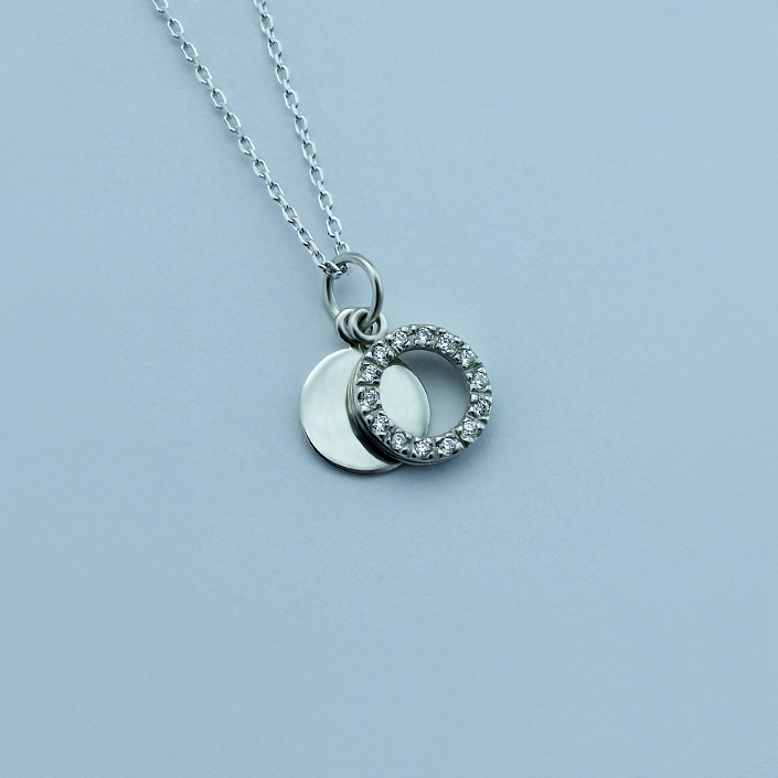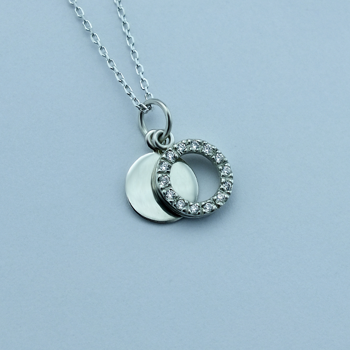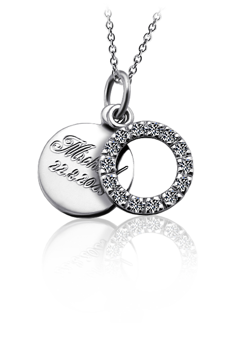 Přívěsek vyrobený ze stříbra ryzosti 925/1000 v lesklé povrchové úpravě. Stříbrný přivěsek je zdobený kruhem ze zirkonů a hladkým kolečkem, připravené na vaše věnování. Rytí jména nebo krátkého věnování je už v ceně přívěsku. Můžete si zvolit lesklé rytí nebo černé. Požadovanou rytinu nám napište do poznámky v objednávce ( třetí krok v košíku ).