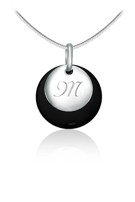 Přívěsek vyrobený ze stříbra a zdobený syntetickým onyxem. Rytí písmena nebo iniciálu je už v ceně přívěsku a mužete si zvolit lesklé rytí nebo černé. Požadovanou rytinu nám napište do poznámky v objednávce.