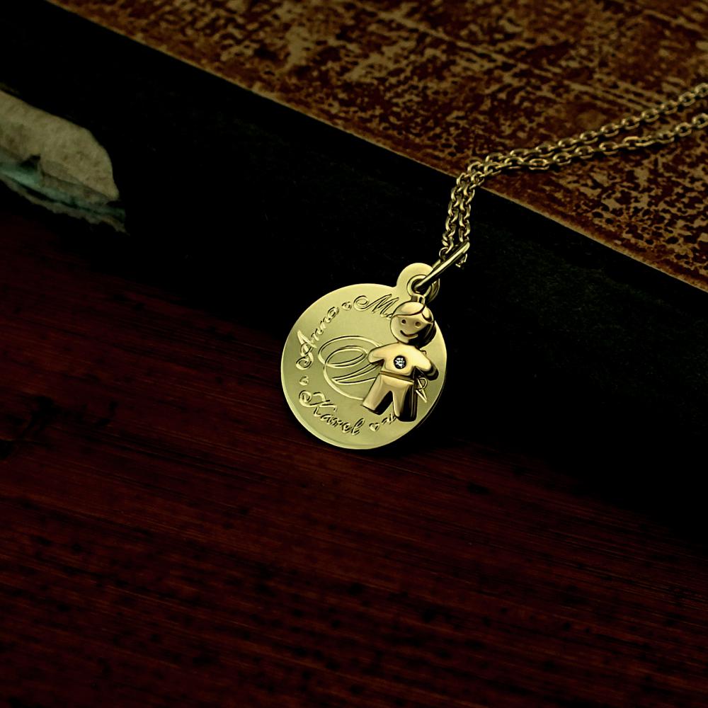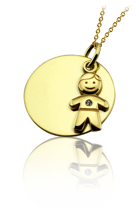 Zlatý přívěsek, ve tvaru kolečka na vaše rytí. Přívěsek je vyrobený ze žlutého zlata ryzosti 585/1000 v lesklé povrchové úpravě a zdobený přívěskem. Rytí jmen nebo věnování na kolečku je zcela na vás, na fotografii je pouze ilustrativní vzor (lze vyrýt max. dvě, tři slova). Veškeré rytí na zlaté kolečko je už zahrnuto v ceně přívěsku. Požadovanou rytinu nám napište do poznámky v objednávce (třetí krok v košíku).