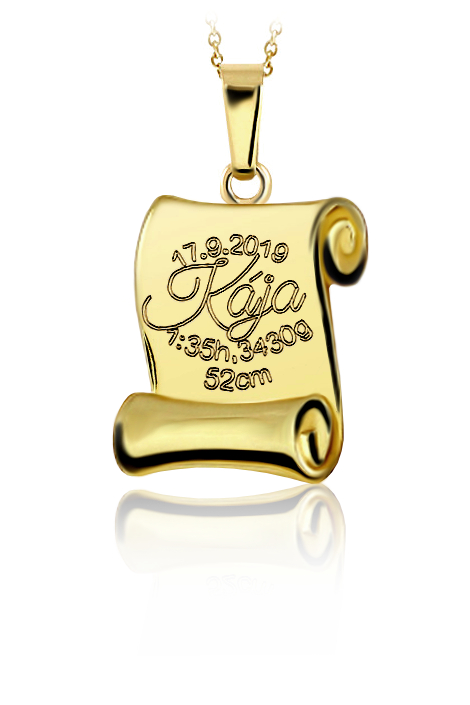 Přívěsek je vyrobený ze žlutého zlata a zdobený vlastním rytím. Pergamen je v lesklé povrchové úpravě v ryzosti 585/1000. Rytí jména nebo iniciálu je už v ceně přívěsku. Požadovanou rytinu nám napište do poznámky v objednávce (třetí krok v košíku).