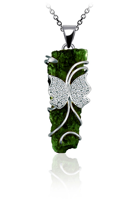Přívěsek s vltavínem ve žlutém zlatě. Na vltavínu je zlatý motýl se zirkony. Motiv na vltavínu můžete změnit (srdíčko,delfín,kolečko). Vyrábíme ze třech materiálu, žluté zlato, bílé zlato a stříbro. Cena stříbrného přívěsku je odvozena od ceny vltavínu.