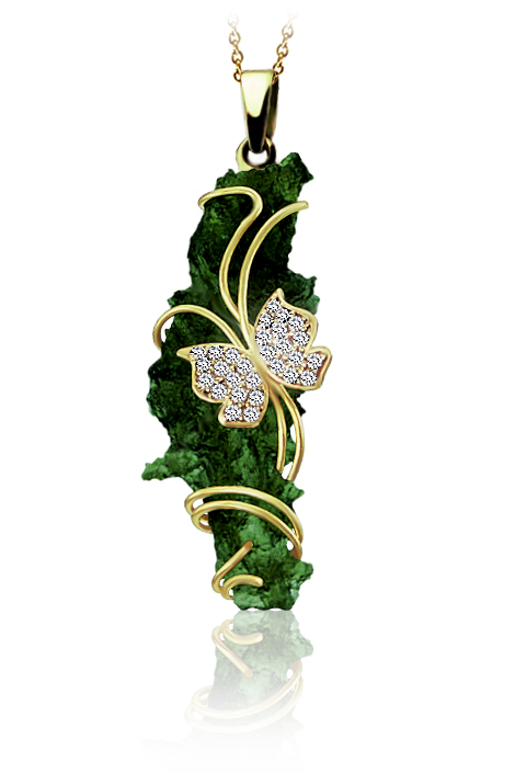 Přívěsek s vltavínem ve žlutém zlatě. Na vltavínu je zlatý motýl se zirkony. Motiv na vltavínu můžete změnit (srdíčko,delfín,kolečko). Vyrábíme ze třech materiálu, žluté zlato, bílé zlato a stříbro. Cena stříbrného přívěsku je odvozena od ceny vltavínu.