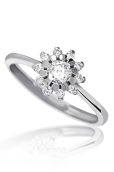 Zásnubní prsten vyroben z bílého čtrnácti karátového zlata ryzosti 585/1000, v lesklé povrchové úpravě s bílými diamanty. Váha prstenu je 3,40 g pro velikost 54. Prstýnek vyrábíme ve všech velikostech. K prstýnku už je zahrnuta krabička na kterou mužeme vyrýt věnování. Rytí a velikost prtenu nám napiśte do poznámky v objednávce ( třetí krok v košíku ).